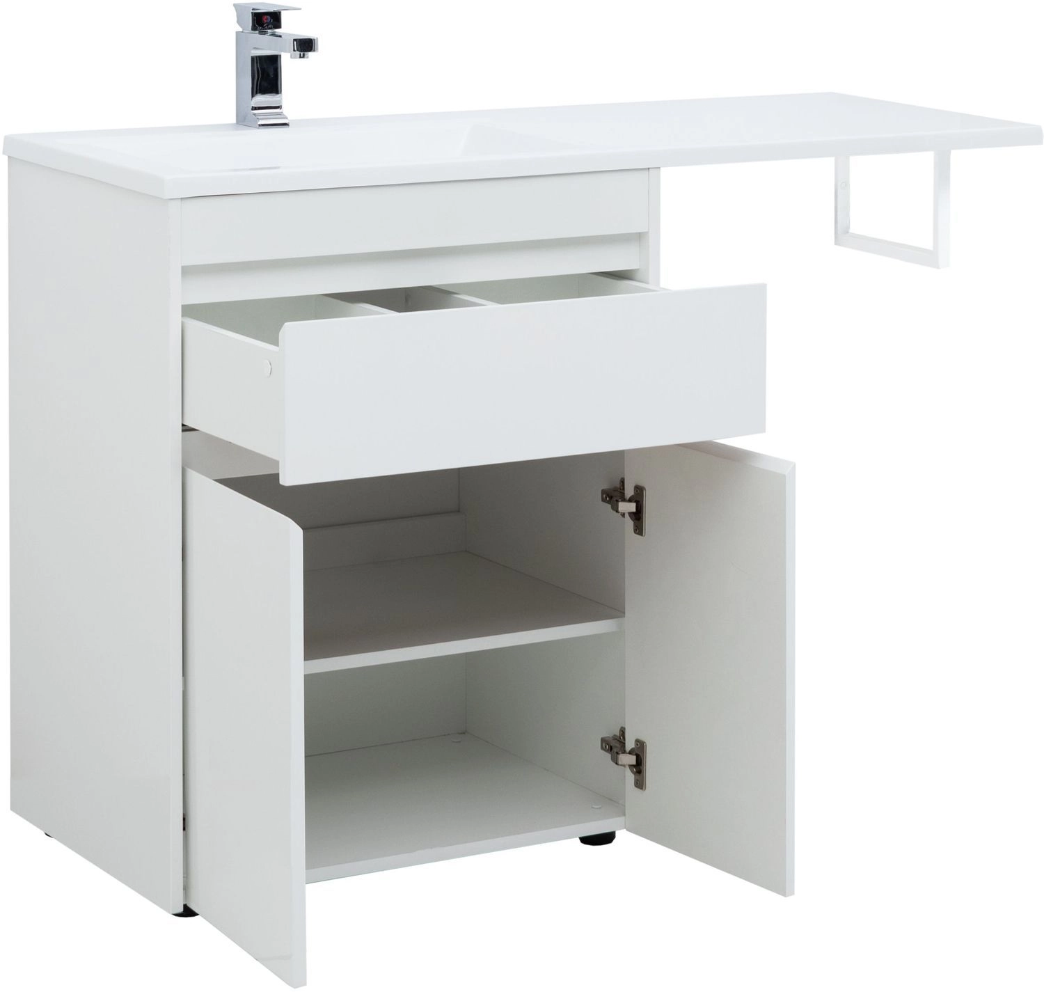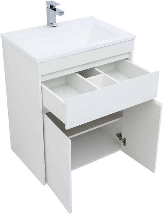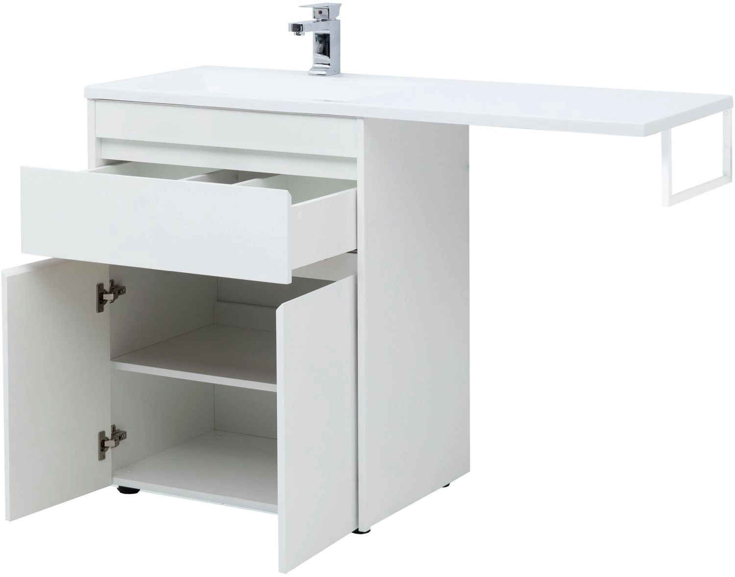 Тумба под раковину Aquanet Токио 130 (напольная, 1 ящик, 2 дверцы) белого цвета представляет новый формат тумб производства Aquanet. Раковина из литьевого мрамора имеет длинную платформу, которая выходит далеко за пределы тумбы. Она предназначена для того, чтобы установить с правой стороны от тумбы стиральную машину. Платформа имеет такую длину, которая позволит спрятать под нее машинку средних размеров с фронтальной загрузкой. Корпус тумбы выполнен из влагостойкого ЛДСП, а фасады – из МДФ с покрытием эмалью. Разнообразные зоны хранения в тумбе шириной 680 мм скрыты в ящике и за распашными дверками. Тумбу можно использовать и без соседства со стиральной машиной, а свободное пространство под платформой раковины занять подкатной тумбой, приспособлениями для уборки помещения или столиком.