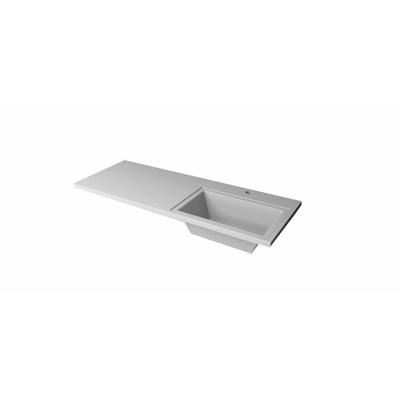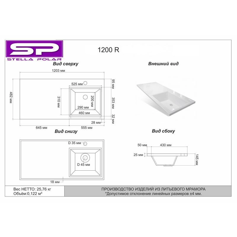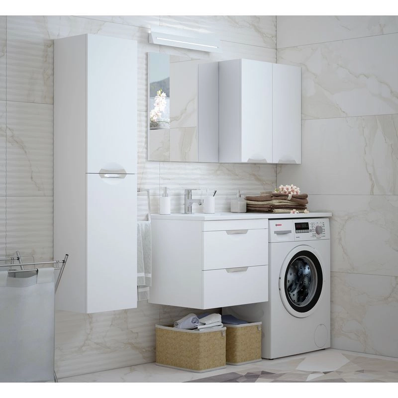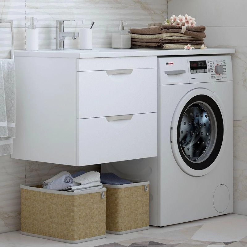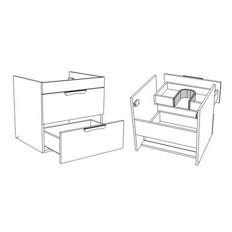 Верхний ящик высотой 70 мм с выпилом под коммуникации, нижний - высотой 110 мм. Для крепления к стене есть подвесы.