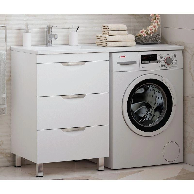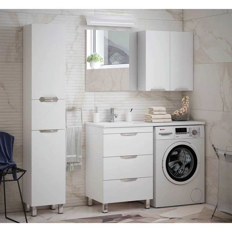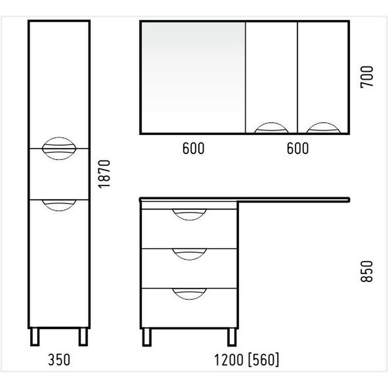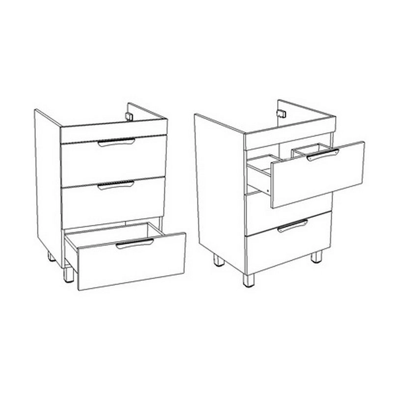 Верхний ящик высотой 70 мм с выпилом под коммуникации, 2 нижних высотой 110 мм. 4 хромовые опоры на 100 мм. Для крепления к стене есть подвесы.