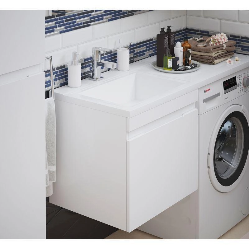 Первый ящик имеет большой внешний фасад без ручки, так как есть специально сделанная фрезеровка для открывания. Ящик высотой 70 мм, оснащен направляющими скрытого монтажа с доводчиками. Второй ящик можно открыть только тогда, когда открыт большой ящик. Второй ящик оснащен направляющими типа push-to-open, что означает следующее - фасад открывается при нажатии. Направляющие второго ящика - с доводчиками. Ящик высотой 70 мм. Оснащен выпилом под коммуникации. Тумба к стене крепится с помощью подвесов Scarpi, которые входят в комплект.