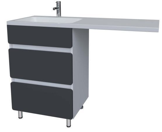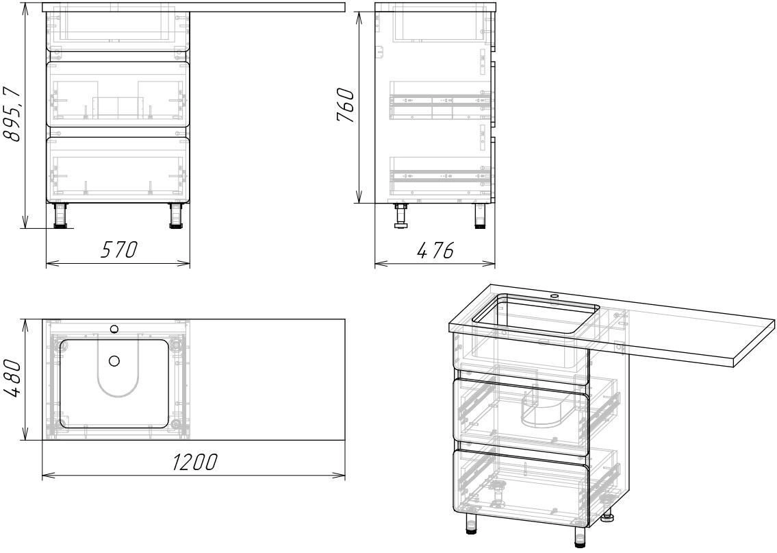 Опоры металлические, петли с доводчиками, ручки открываются за фасад. 2 ящика