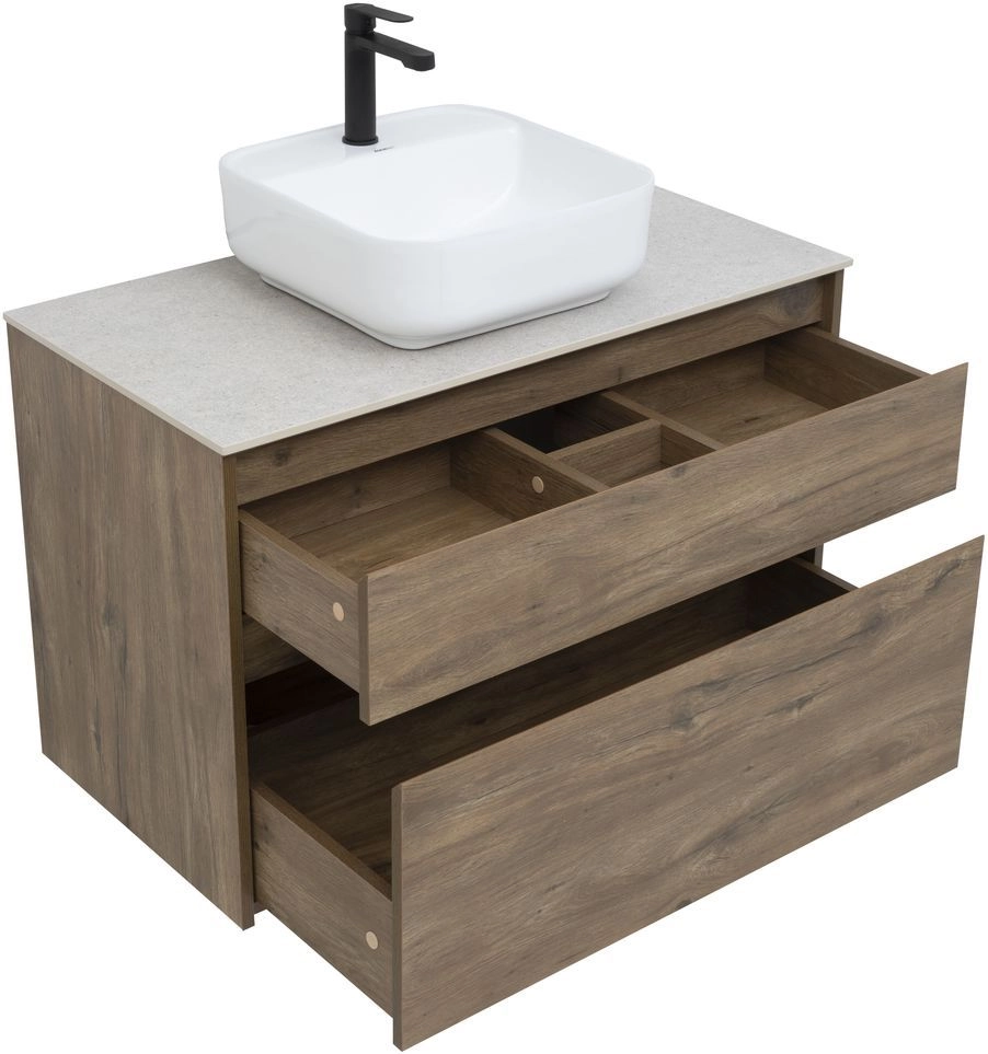 Тумба под раковину Aquanet Nova Lite 90 из влагостойкой ламинированной древесно-стружечной плиты в изысканном цвете «дуб рустикальный» имеет достойный вид. Фактура натурального дерева выглядит благородно, а подвесной монтаж придает визуальную легкость тумбе шириной 90 см. Она оборудована двумя выдвижными ящиками. Ящики довольно вместительные и позволяют разместить все необходимое. Фасады выполнены с декоративной интегрированной ручкой, не имеющей острых краев и внутренних углов, что обеспечивает удобство в эксплуатации и легкий уход за мебелью. Ящики комплектуются направляющими немецкого производства Hettich Quadro, оснащенными доводчиками. Для комплектации тумбы можно выбрать накладную раковину и столешницу, в которой уже предусмотрено отверстие для установки накладной раковины.
