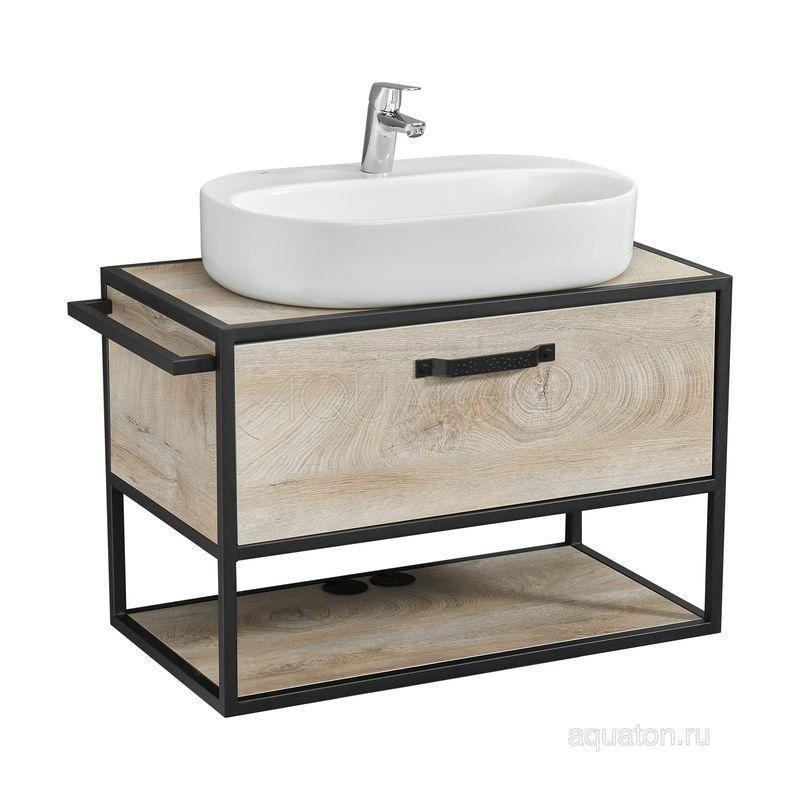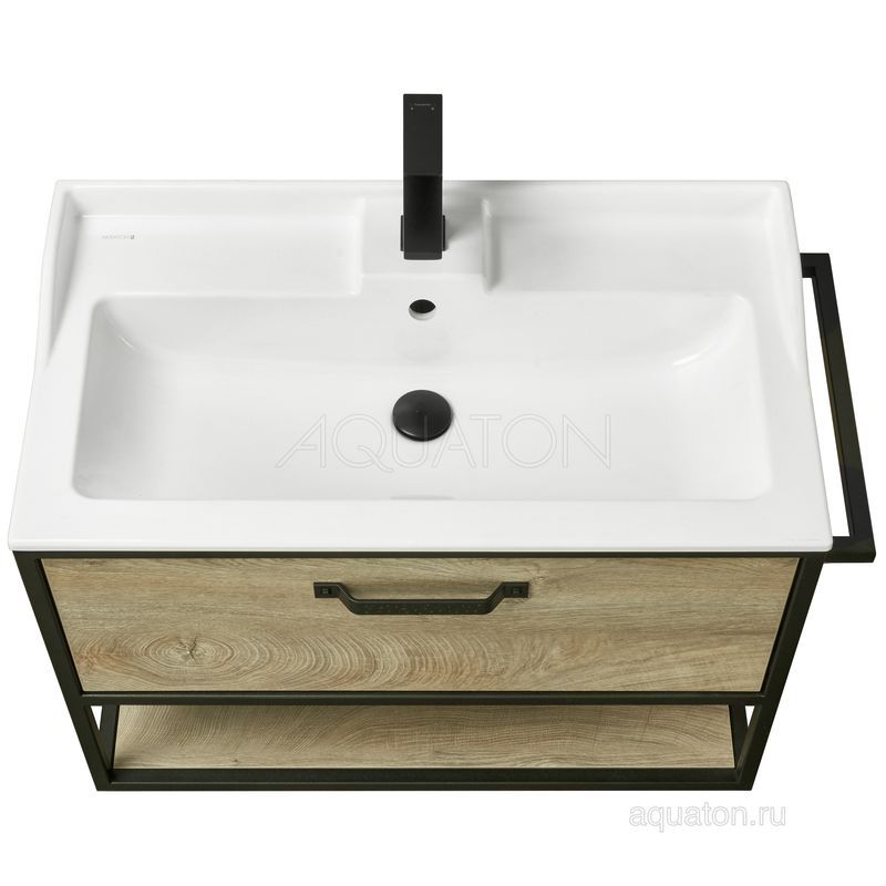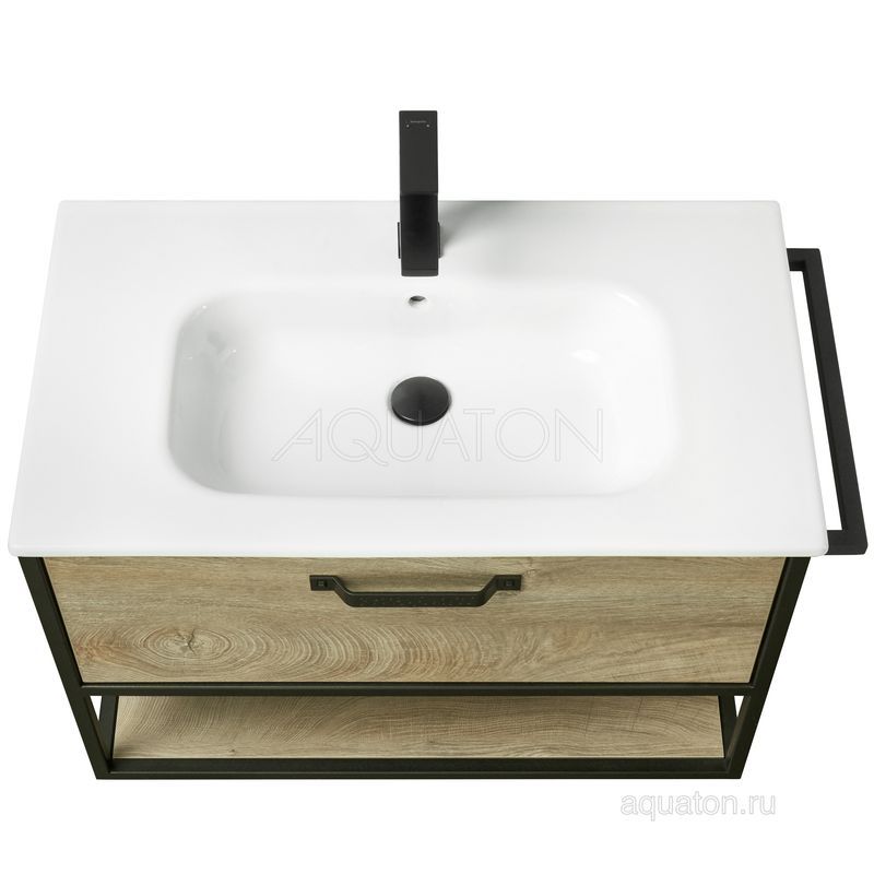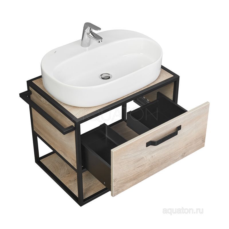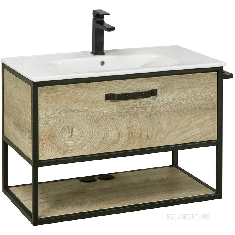 Тумба Лофт Фабрик 80 в цвете Дуб Эндгрейн – это сочетание насыщенного древесного декора и благородства металла. Удобный вместительный ящик, снабженный направляющими плавного выдвижения, и открытая нижняя полка позволят разместить все необходимое. Для данной тумбы доступно три варианта комплектации: с керамической раковиной Victoria от бренда Roca, с раковиной Фабиа 80 из прочного литьевого мрамора и с накладной керамической раковиной на столешницу, столешница заказывается отдельно. Оригинальная ручка идеально сочетается с металлическими черными профилями и полотенцедержателем. Полотенцедержатель можно установить опционально по желанию клиента слева или справа.