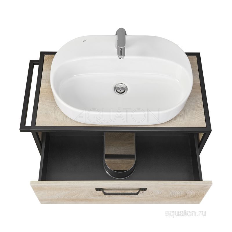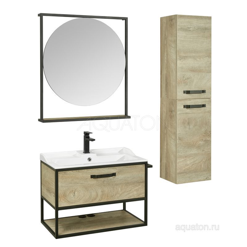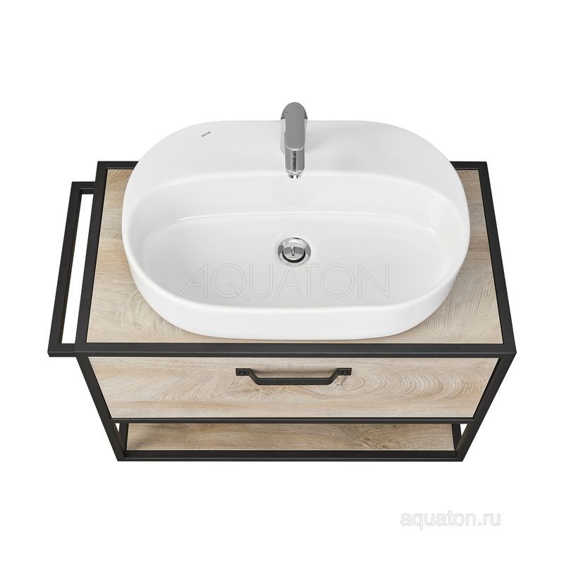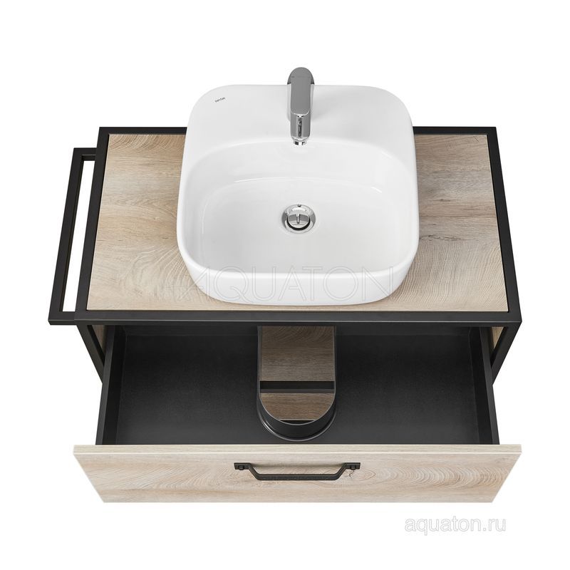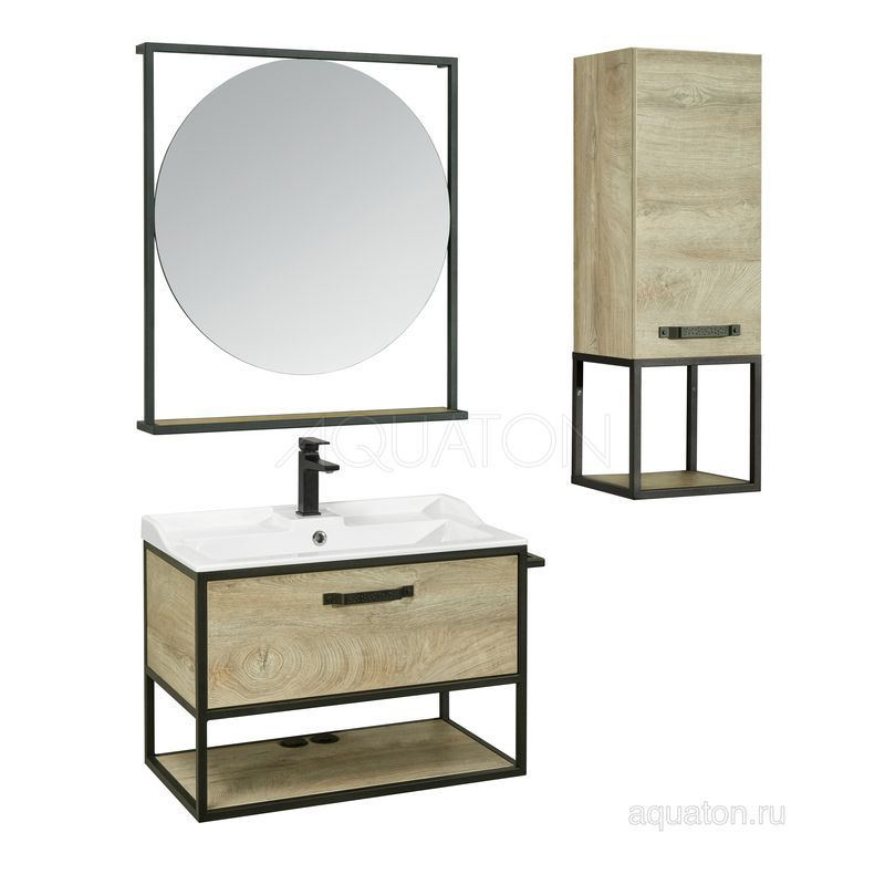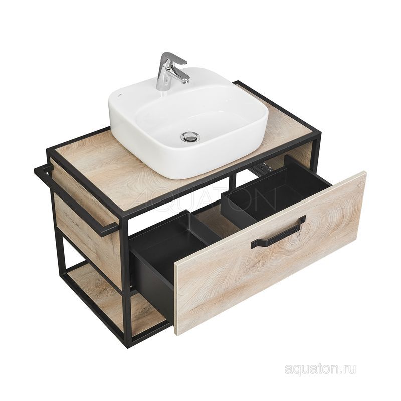 Тумба Лофт Фабрик 80 в цвете Дуб Эндгрейн – это сочетание насыщенного древесного декора и благородства металла. Удобный вместительный ящик, снабженный направляющими плавного выдвижения, и открытая нижняя полка позволят разместить все необходимое. Для данной тумбы доступно три варианта комплектации: с керамической раковиной Victoria от бренда Roca, с раковиной Фабиа 80 из прочного литьевого мрамора и с накладной керамической раковиной на столешницу, столешница заказывается отдельно. Оригинальная ручка идеально сочетается с металлическими черными профилями и полотенцедержателем. Полотенцедержатель можно установить опционально по желанию клиента слева или справа.