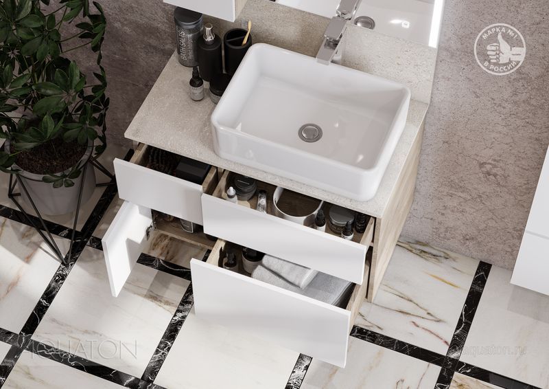 Тумба Мишель 80 очень функциональна: слева располагается небольшой выдвижной ящик, идеально подходящий для хранения мелочей, под которым находится отделение со створкой, а справа у тумбы расположены два вместительных ящика полного выдвижения, снабженных доводчиками. Все ящики и створка открываются с помощью системы push-to-open. На выбор квозможно приобрести тумбу с традиционной столешницей из ВЛДСП или из керамогранита.