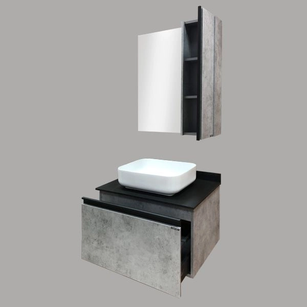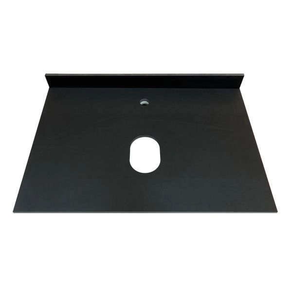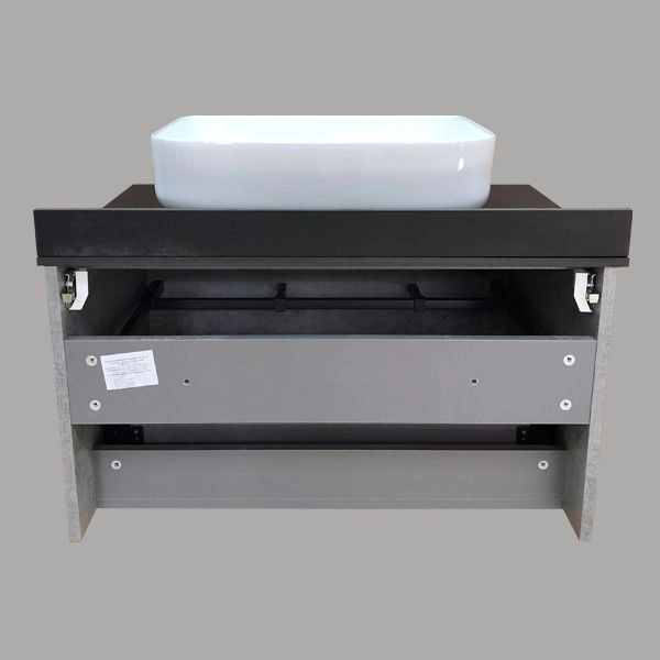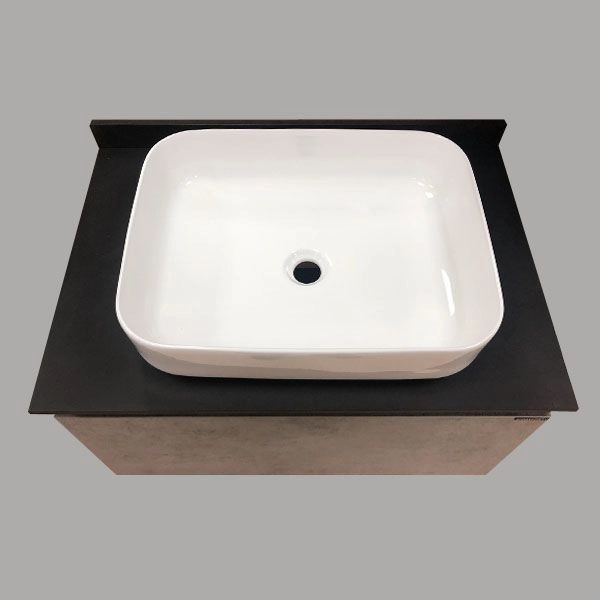 Тумба укомплектована столешницей и плинтусом из черного керамогранита и накладной прямоугольной раковиной Comforty T-Y9378.