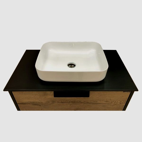 Комплектация: накладная раковина Comforty T-Y9378, столешница и пристенный плинтус из черного керамогранита.