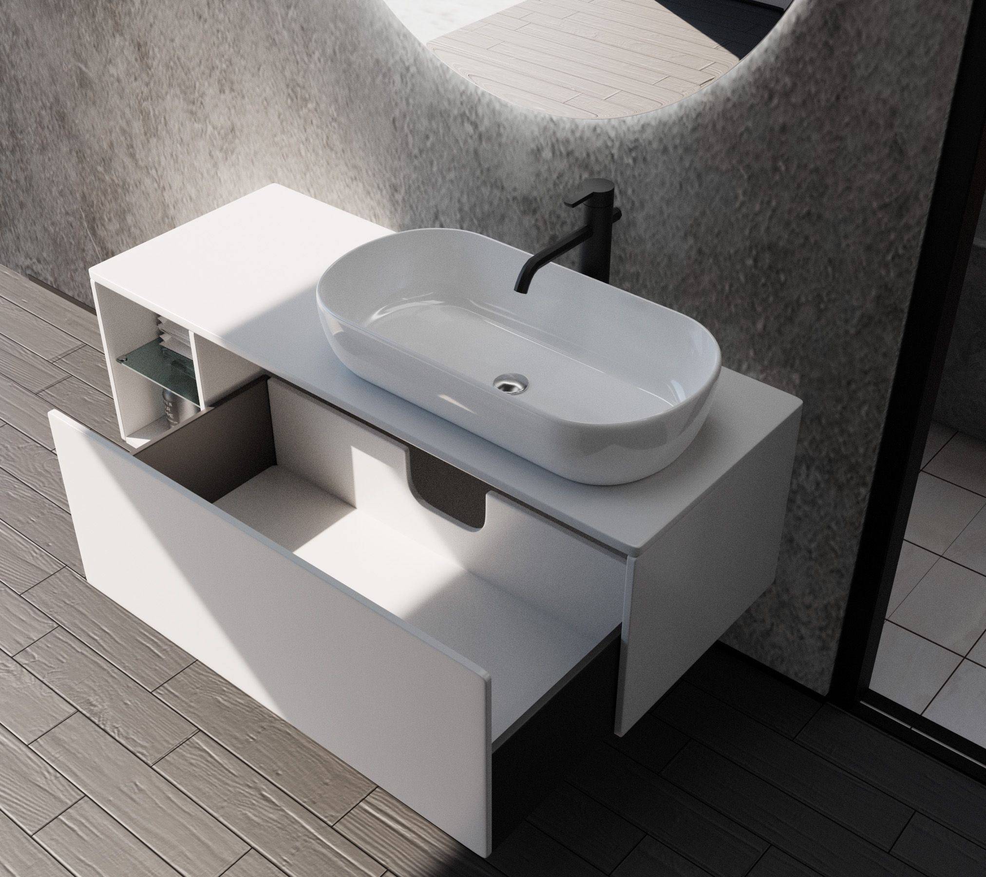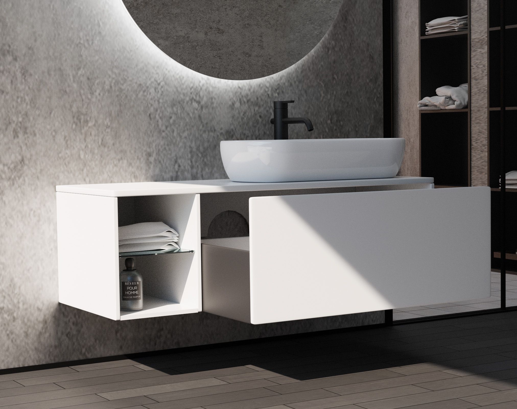 Комплект Оскар – это подвесная тумба с одним ящиком полного выдвижения оснащенными системой плавного закрывания «Push-To-Open».и нишей со стеклянной полочкой
