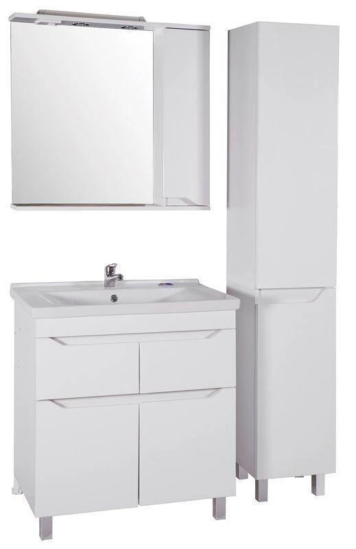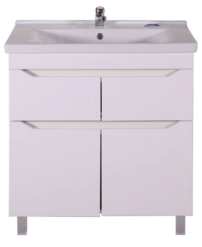 Напольная тумба с выдвижными ящиками. В комплект входят хромированные ножки. Ручки интегрированы в фасад ящиков