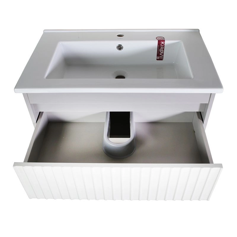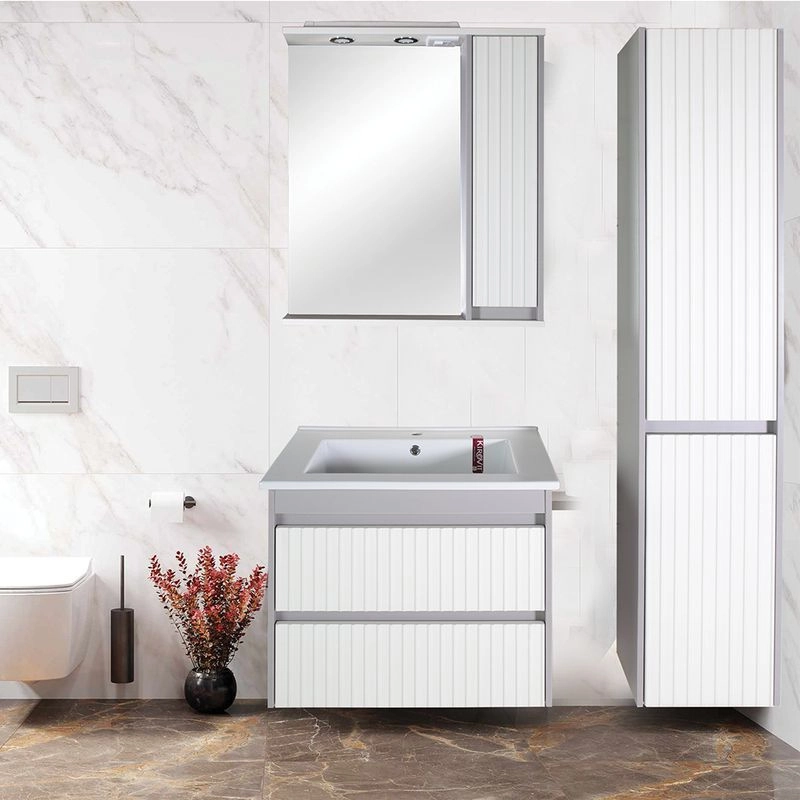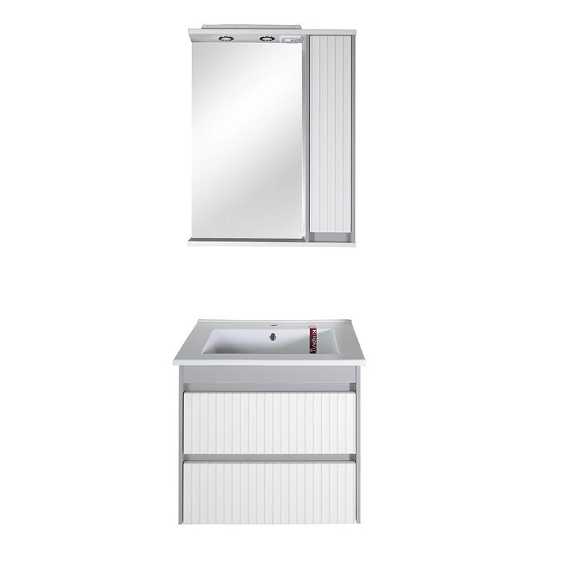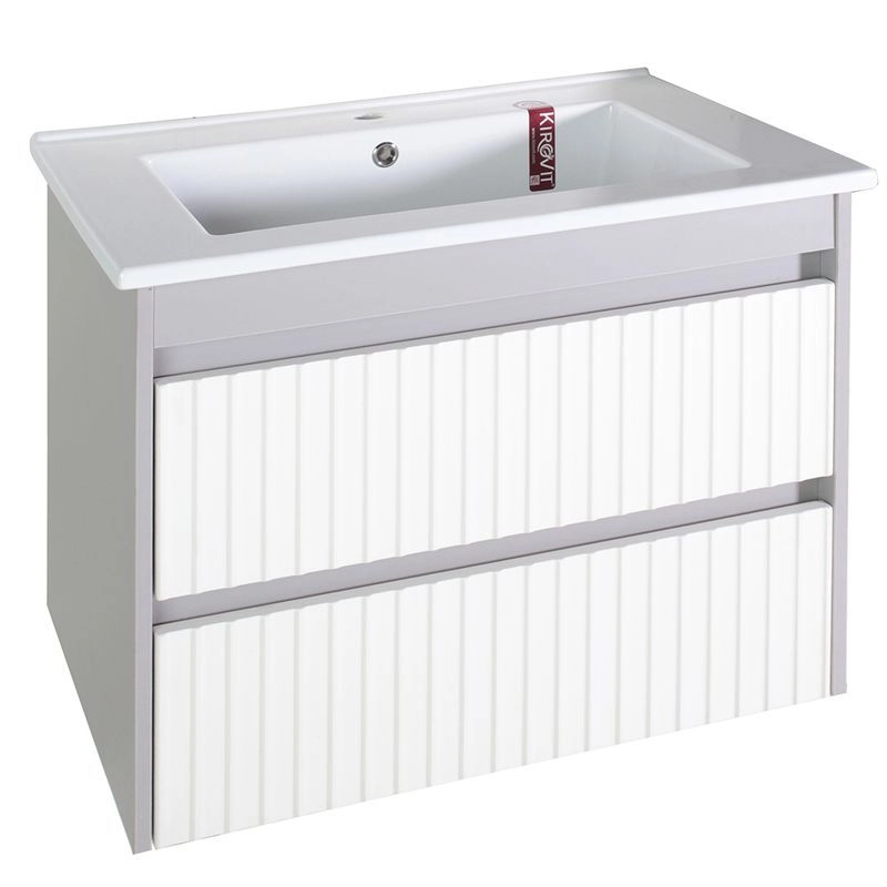 Модель изготавливается в современном стиле и сочетает в себе корпус из влагостойкого ЛДСП и рифленые фасады из МДФ .
