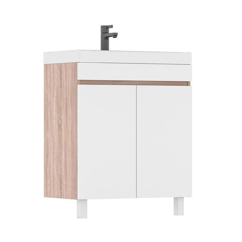 Напольная тумба с двумя распашными дверцами. Внутри полка из ЛДСП. Петли на дверцах оснащены доводчиками. Дверцы тумбы изготовлены из МДФ, облицованы глянцевой пленкой ПВХ. Дверцы открываются при помощи интегрированных ручек. Тумба устанавливается на две регулируемые опоры и фиксируется к стене при помощи креплений.