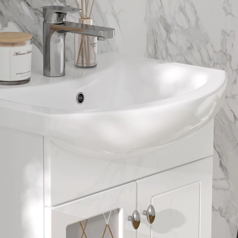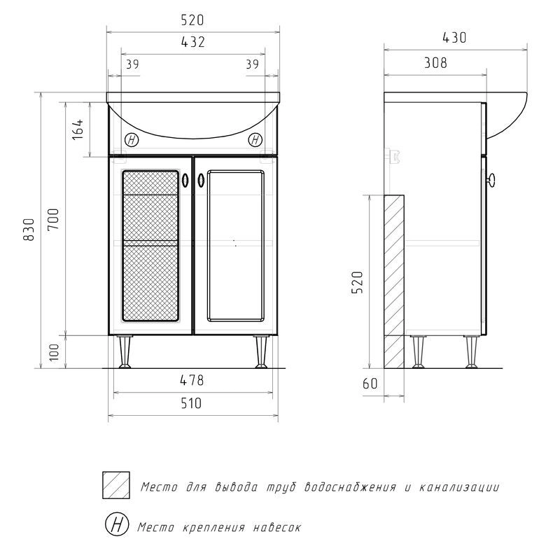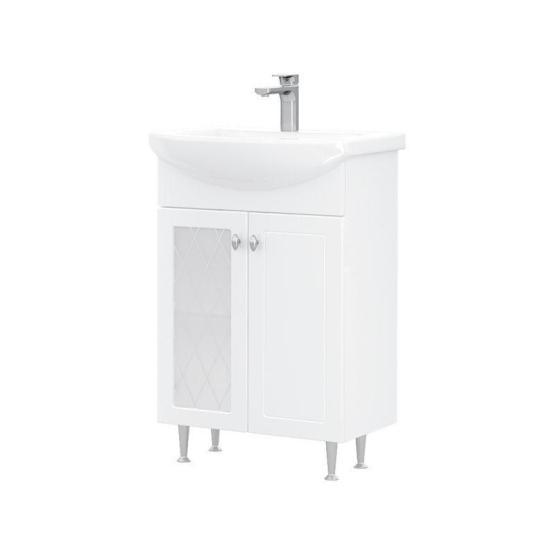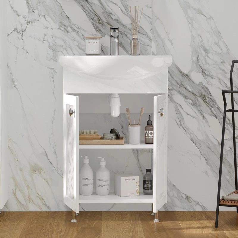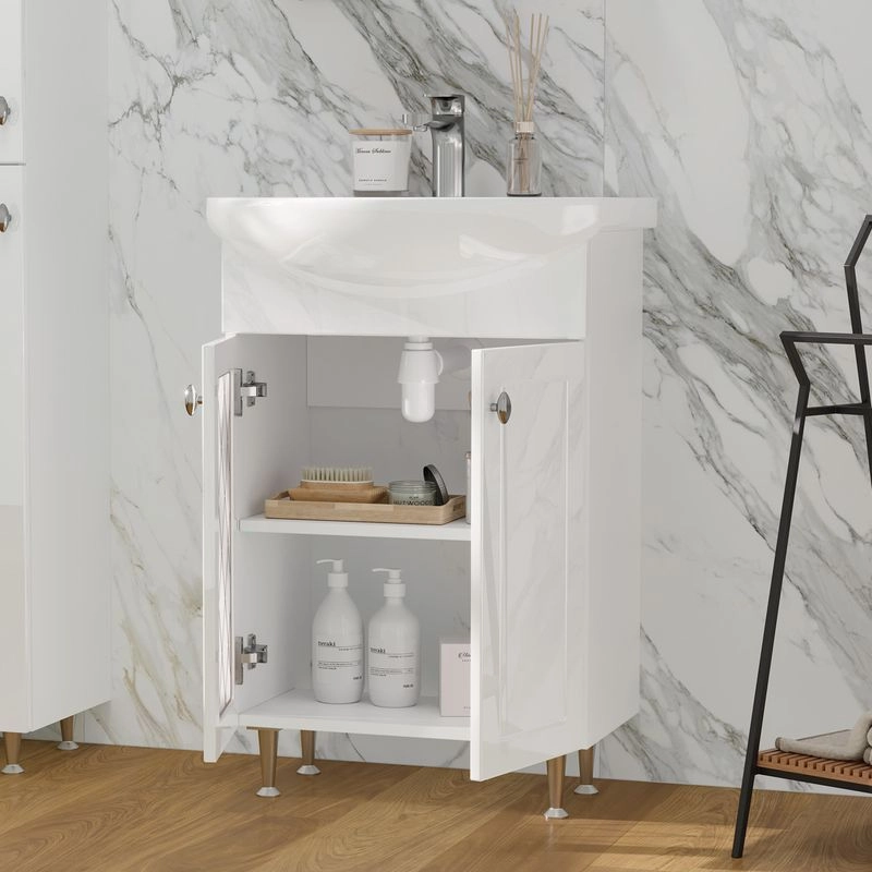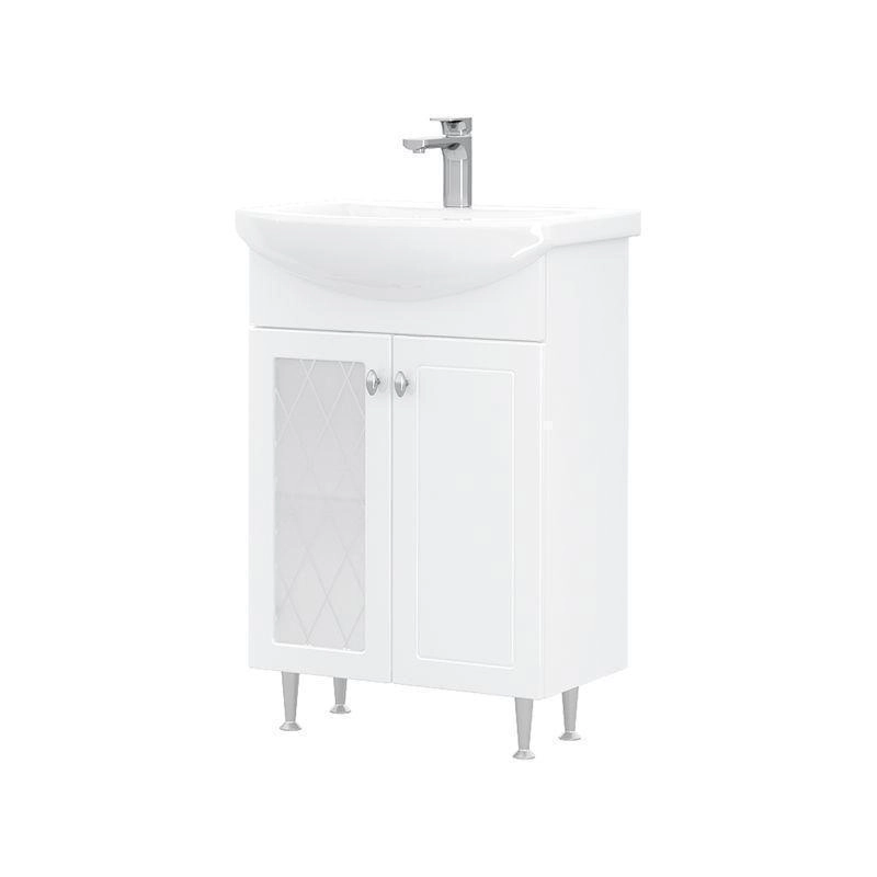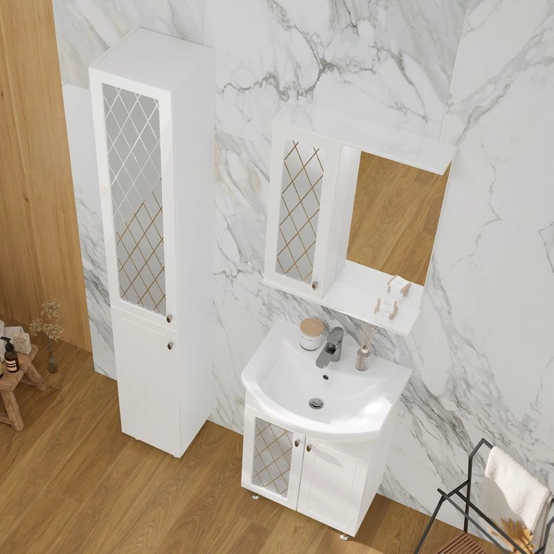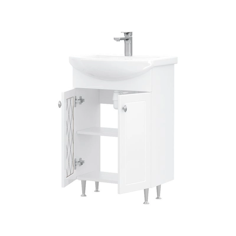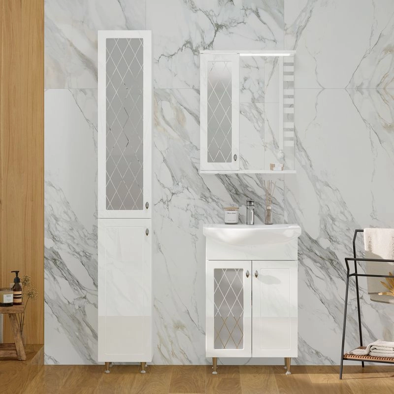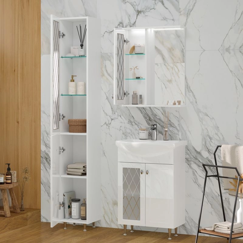 Напольная тумба с двумя распашными дверцами. Внутри полка из ЛДСП. Петли оснащены доводчиками. Дверцы изготовлены из МДФ, облицованным глянцевой пленкой ПВХ. В левой дверце установлена вставка из зеркального полотна с рисунком амальгамой. Лицевая фурнитура хром. Тумба устанавливается на четыре регулируемые опоры и фиксируется к стене при помощи креплений. Вставка из зеркального полотна с рисунком амальгамой, фурнитура с доводчиками