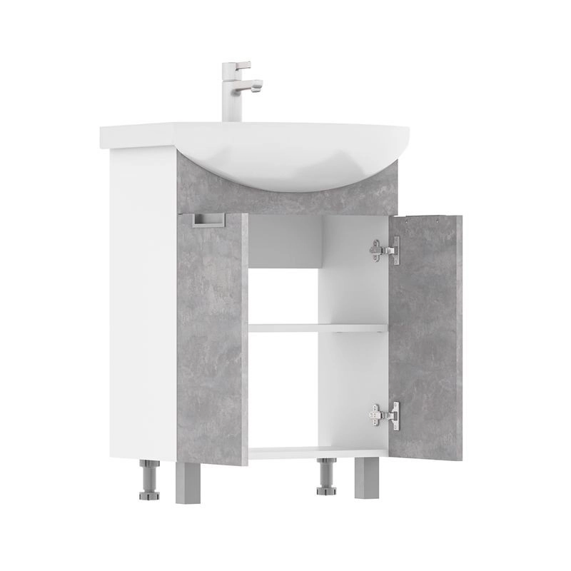 Напольная тумба с двумя распашными дверцами. Внутри полка из ЛДСП. Петли на дверцах оснащены доводчиками. Дверцы и корпус тумбы изготовлены из ЛДСП. Тумба устанавливается на четыре регулируемые опоры и фиксируется к стене при помощи креплений.