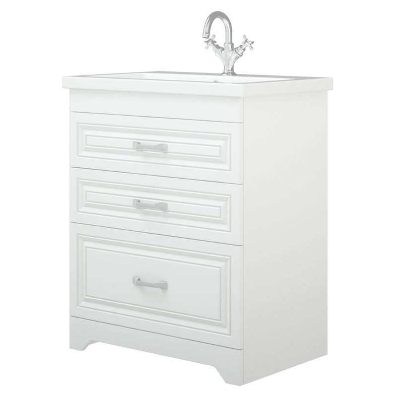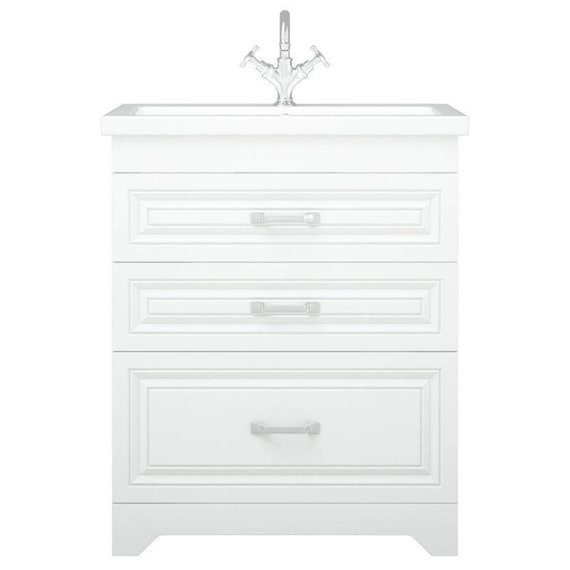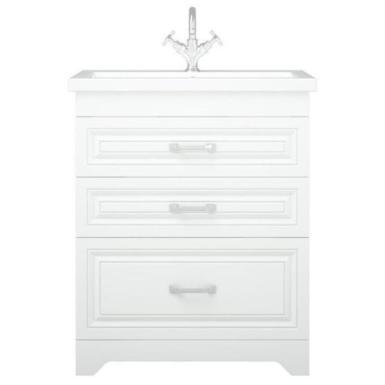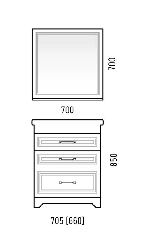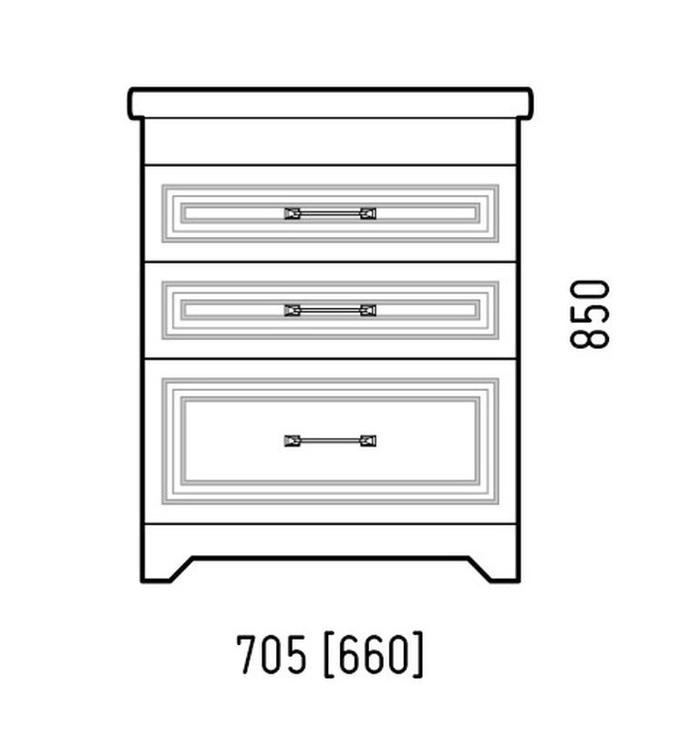 Тумба Каролина 70 оснащена 3-мя выдвижными ящиками на направляющих скрытого монтажа. Верхний ящик высотой 80 мм с выпилом под коммуникации, средний - 80 мм, нижний - 130 мм. Коромысло, фасады, цоколь - МДФ в плёнке ПВХ.