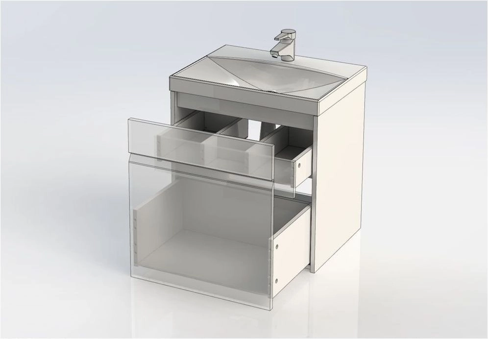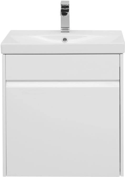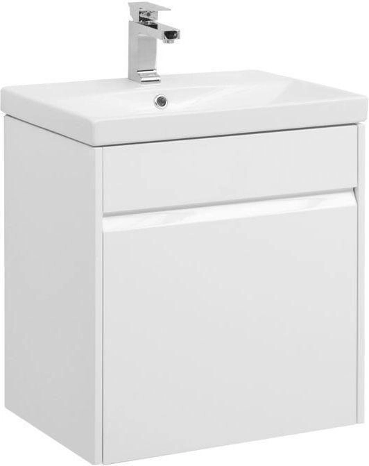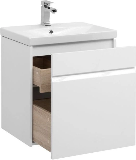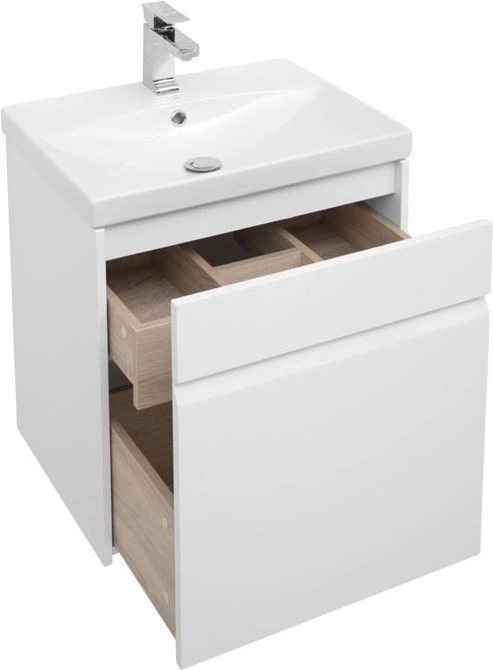 Тумба под раковину Aquanet Палермо белого цвета шириной 60 см с корпусом из влагостойкого ЛДСП интересен в первую очередь игрой деталей. Так, полоса глубокой фрезеровки на фасаде - это вовсе не декоративная деталь, как может показаться на первый взгляд, а удобная интегрированная ручка - модный мебельный тренд. А фасадов не два, как видится сначала, а всего один, и это внешняя деталь одного выдвижного ящика. Второй ящик тоже есть, но он скрывается внутри. Неглубокий, но сегментированный на три секции, что особенно придется по вкусу женщинам, так как в них можно разместить столько полезных мелочей. Тумба предлагается в комплекте с удобной керамической раковиной с узкими бортиками, которая устанавливается в один уровень с корпусом, что смотрится одновременно и просто, и красиво.