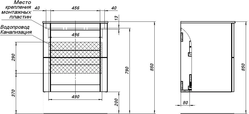 В столешнице Терра предусмотрены 2 отверстия: под слив раковины и под смеситель с установкой на столешницу. Расположение смесителя - за чашей раковины, по центру.