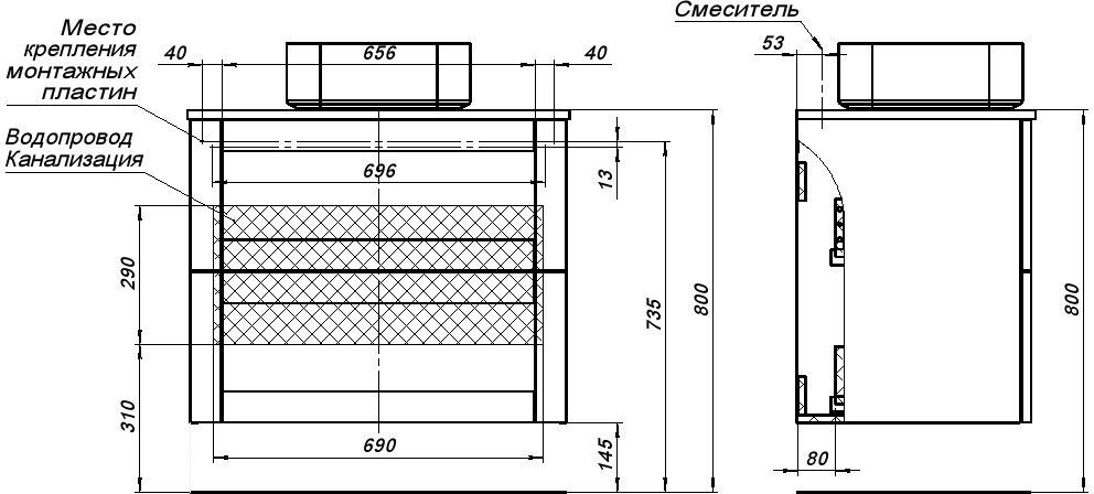 В столешнице Терра предусмотрены 2 отверстия: под слив раковины и под смеситель с установкой на столешницу. Расположение смесителя - за чашей раковины, по центру.