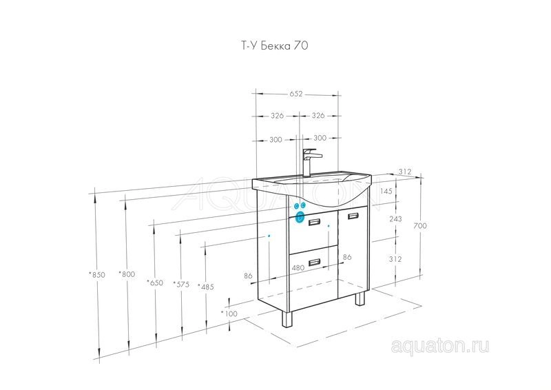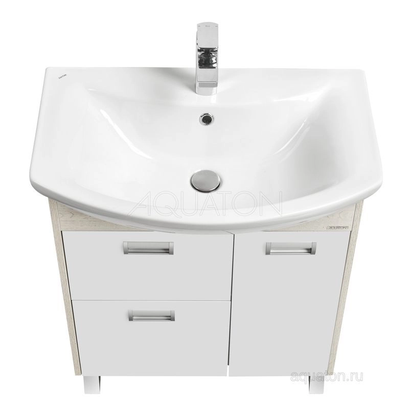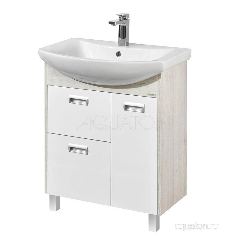 У тумбы размера 70 см слева расположены два ящика полного выдвижения, а справа - фасад-створка, петли с доводчиками. В комплект входит регулируемая по высоте полка. Тумбы установлены на металлические ножки и укомплектованы практичными врезными ручками, которые очень удобны в использовании. Боковые стенки и фигурная планка под раковиной изготовлены из ламинированной, текстурированной влагостойкой ЛДСП в цвете дуб сомерсет, а фасады - из крашеной в белый цвет влагостойкой ЛДСП.