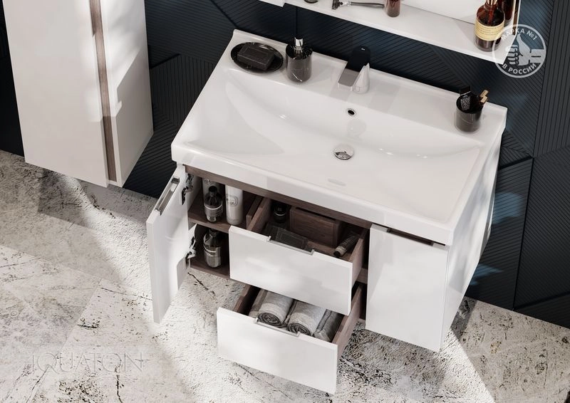 Подвесная тумба Рене 80 от AQUATON в комбинированной отделке белый глянец и грецкий орех отличается изысканной простотой, практичностью и функциональностью. Корпус из влагостойкой ЛДСП и фасады из высококачественной МДФ отлично подходят для пространств с повышенной влажностью. Контрастное сочетание белого глянца и стильной расцветки грецкий орех добавляет модели выразительности. Тумба достаточно вместительна и предлагает удобную систему внутренней организации: в центре находятся два выдвижных ящика со встроенной системой плавного выдвижения, а слева и справа за фасадами-створками скрыты дополнительные отсеки для хранения. Ручки, изящно интегрированные в фасады, обеспечивают удобную и комфортную эксплуатацию. Строгий и лаконичный дизайн модели подчеркивает гладкая поверхность фасадов без выступающих элементов.