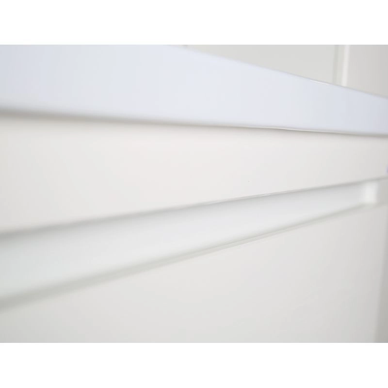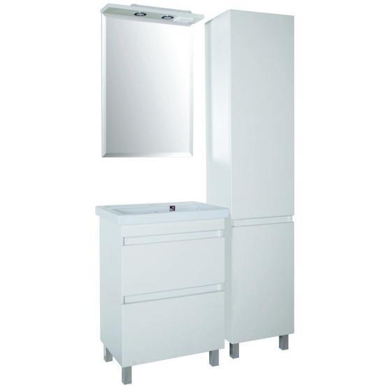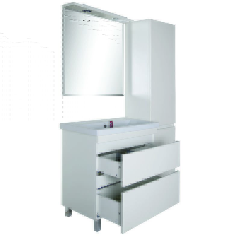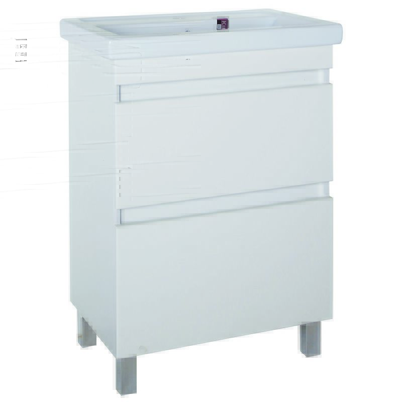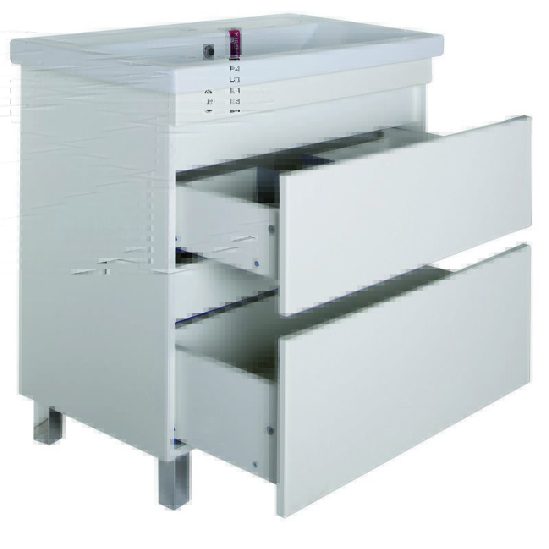 Напольная тумба с двумя выдвижными ящиками. В комплект входят хромированные ножки. Ручки интегрированы в фасад ящиков. Покрытие пленка. Раковина приобретается отдельно