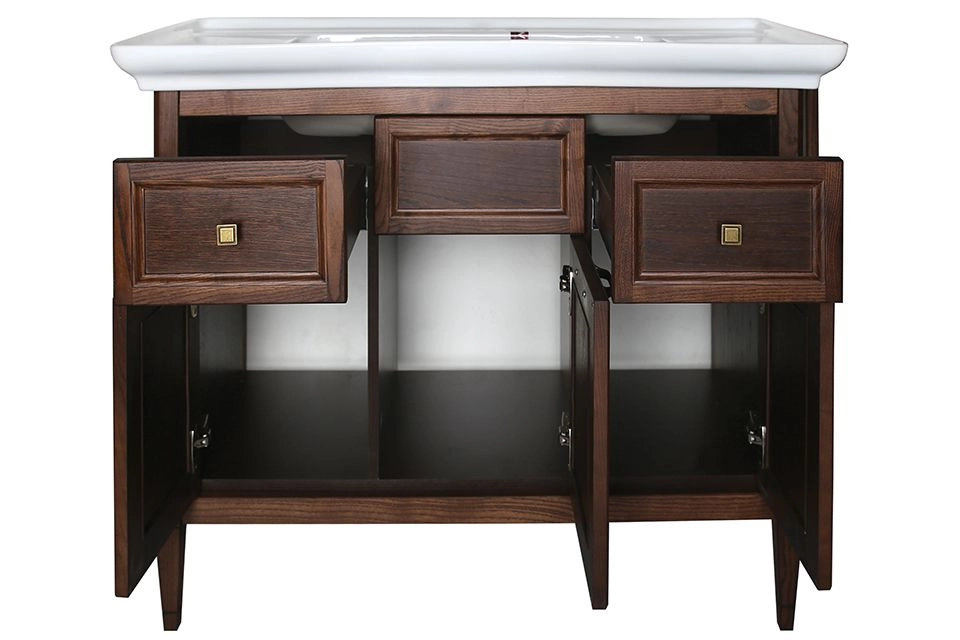 Корпус и фасад комплекта выполнены из массива ясеня. Совокупность легкости и изящества в изысканном и утонченном европейском классическом стиле комплекта Модерн, изготавливаемого из массива натурального дерева, позволяет оригинально и лаконично решить эксклюзивный интерьер ванной комнаты. На поверхности мебели подчеркивается текстура дерева. Объемная элитная раковина в современном итальянском стиле блистает и переливается на нежных изгибах. Элегантное эффектное зеркало создаёт яркое впечатление. Комплект полностью оснащен системой плавного доведения движения от крупных европейских производителей. Модерн – это уникальная и надёжная мебель для привилегированной ванной комнаты.