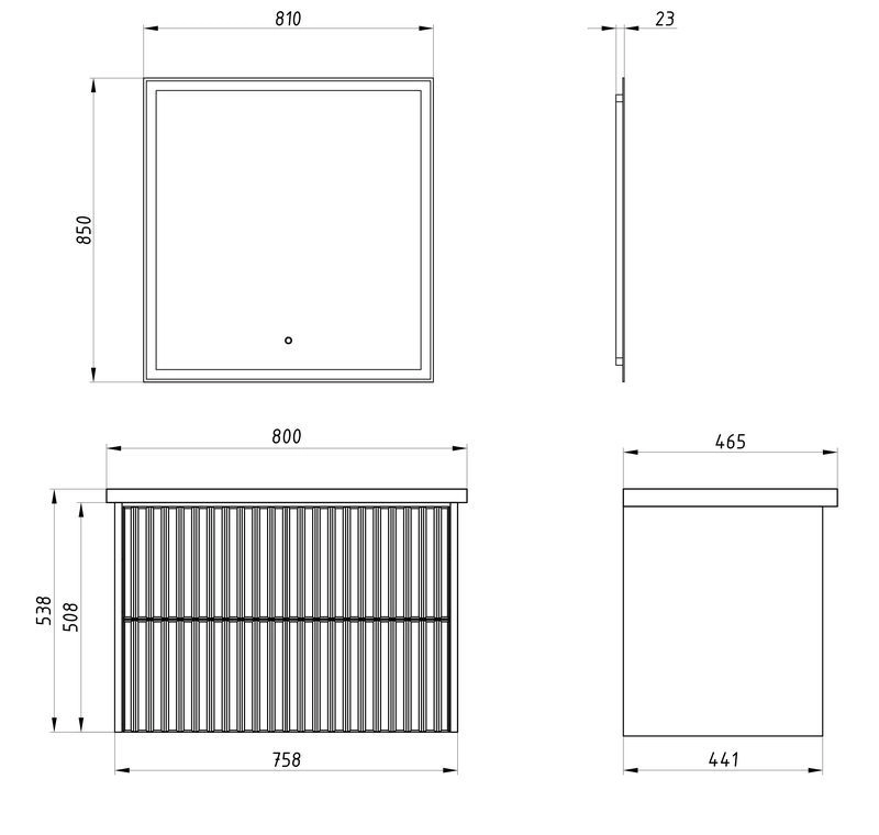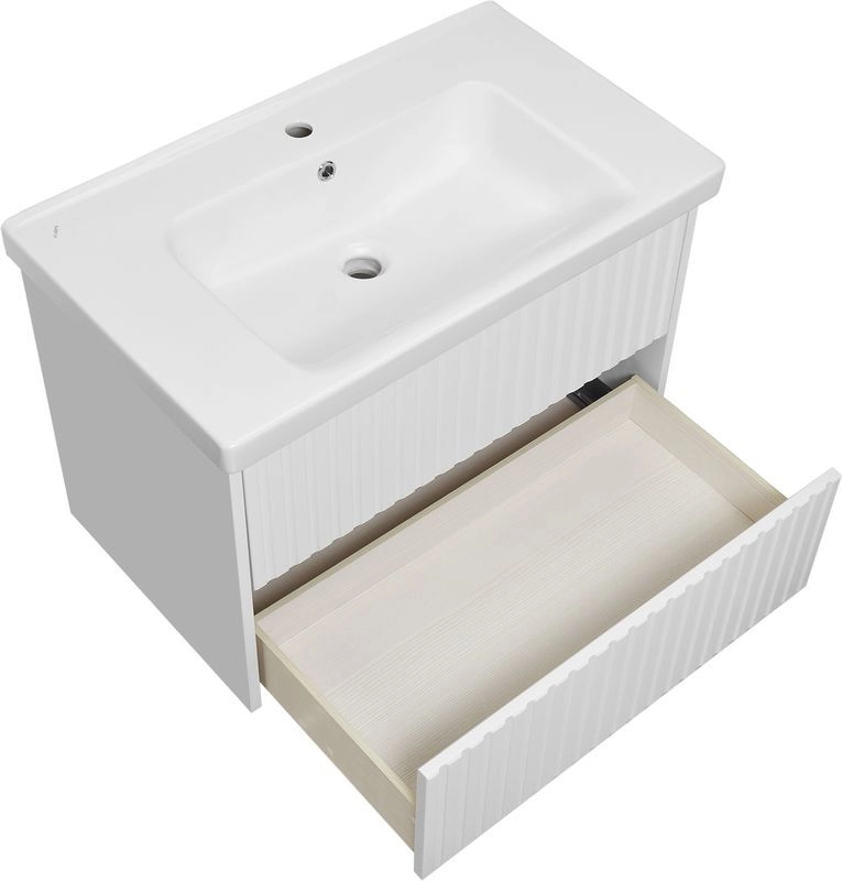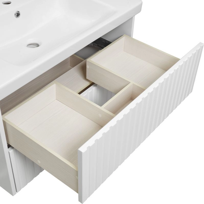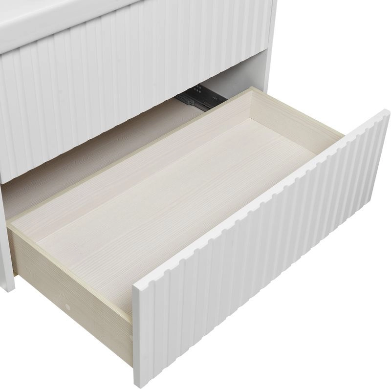 Подвесная тумба из влагостойкого МДФ с двумя выдвижными ящиками, оснащенными механизмом PUSH TO OPEN, (позволяющим открыть ящик касанием руки), ящики полного выдвижения