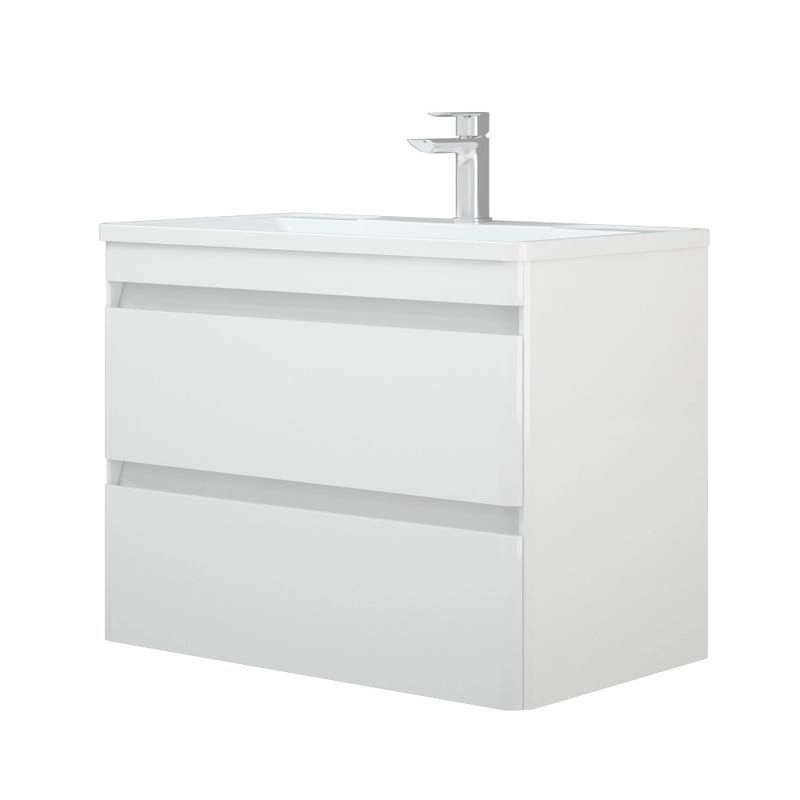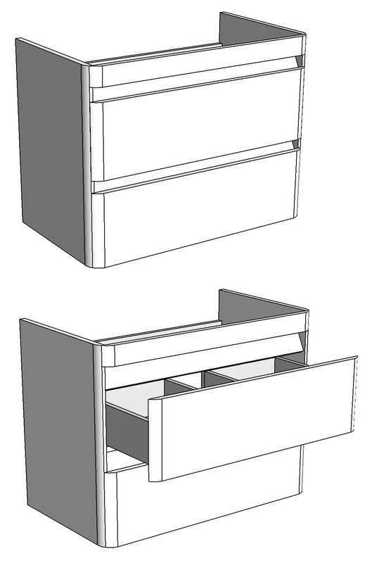 Подвесная тумба имеет интересный эргономичный дизайн - скругление боковин плавно переходит в скругления на фасадах. У тумбы 2 выдвижных ящика на направляющих скрытого монтажа с доводчиками. Нижний ящик цельный, верхний разделен на 2 отделения, с местом под коммуникации посередине. Верхний ящик высотой 100 мм с выпилом под коммуникации, нижний высотой 170 мм. Коромысло, боковины, фасады - МДФ в плёнке. Фасады не имеют ручек, конструктив тумбы позволяет открывать фасады без использования ручек.