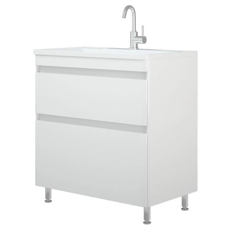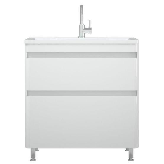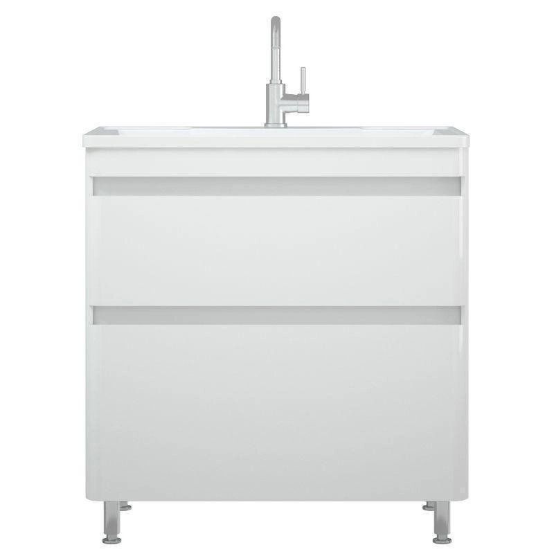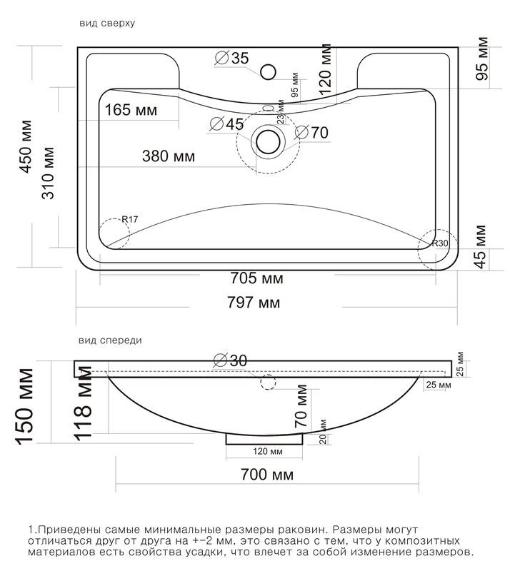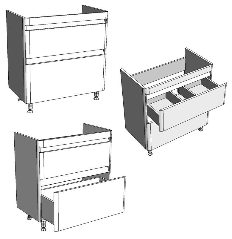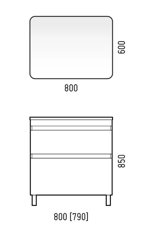 Тумба имеет интересный эргономичный дизайн - скругление боковин плавно переходит в скругления на фасадах. У тумбы 2 выдвижных ящика на направляющих скрытого монтажа с доводчиками. Нижний ящик цельный, верхний разделен на 2 отделения, с местом под коммуникации посередине. Верхний ящик высотой 100 мм с выпилом под коммуникации, нижний высотой 100 мм. Для крепления к стене есть подвесы. Коромысло, боковины, фасады - МДФ в плёнке. Фасады не имеют ручек, конструктив тумбы позволяет открывать фасады без ручек.