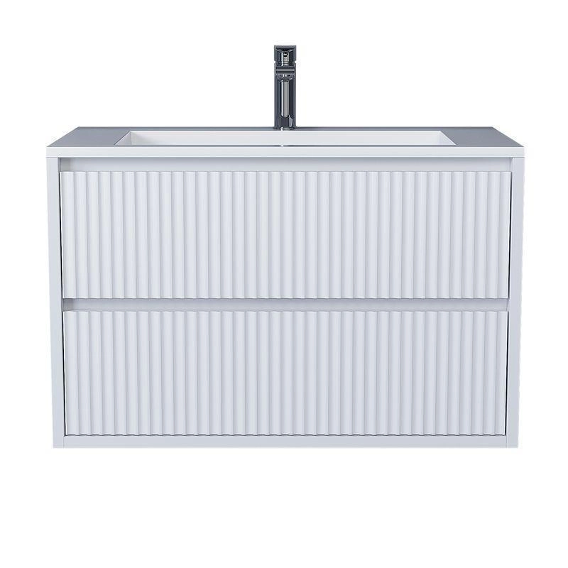 Фасад и боковые стенки изделия выполнены из МДФ толщиной 16 мм. Фасады с вертикальной фрезеровкой. Выдвижные ящики изготовлены из влагостойкой ЛДСП. Ящики оснащены доводчиками. Вся фурнитура и доводчики премиум-класса.