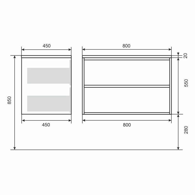 Подвесная тумба с двумя выдвижными ящиками Next Premium шириной 80 см подходит под раковину из коллекции Uperwood Next Premium 80 см (800 х 450 х 130 мм) глянцевого белого цвета (арт. 290000009) и серого глянцевого цвета (арт. арт. 290000019)