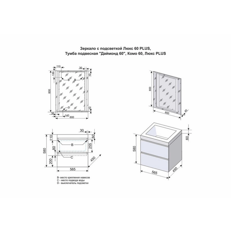 —Тумба под раковину Style Line Elfante Даймонд 60 подвесная, Комо 60, Люкс белая, PLUS