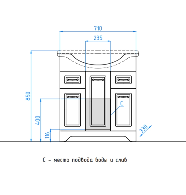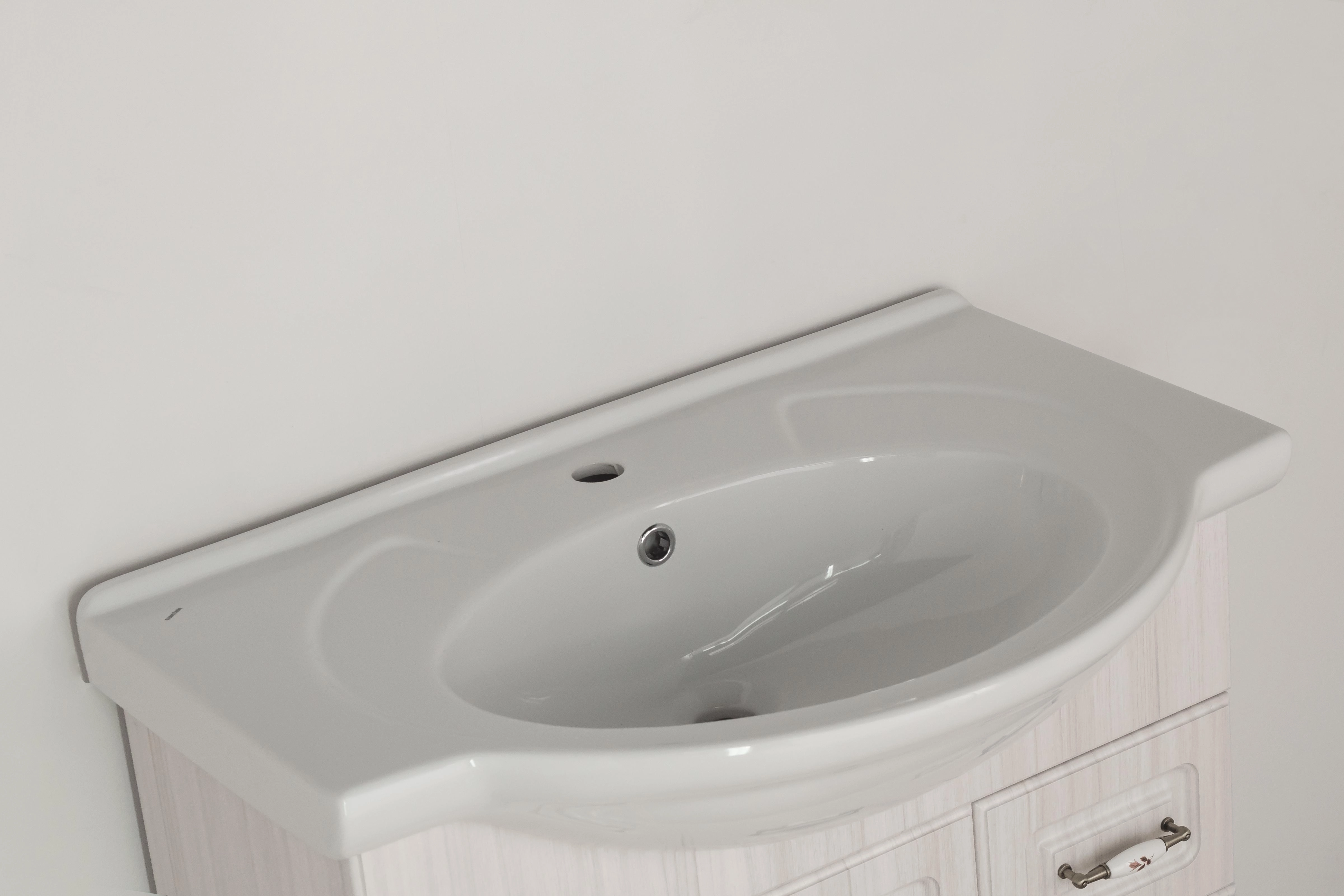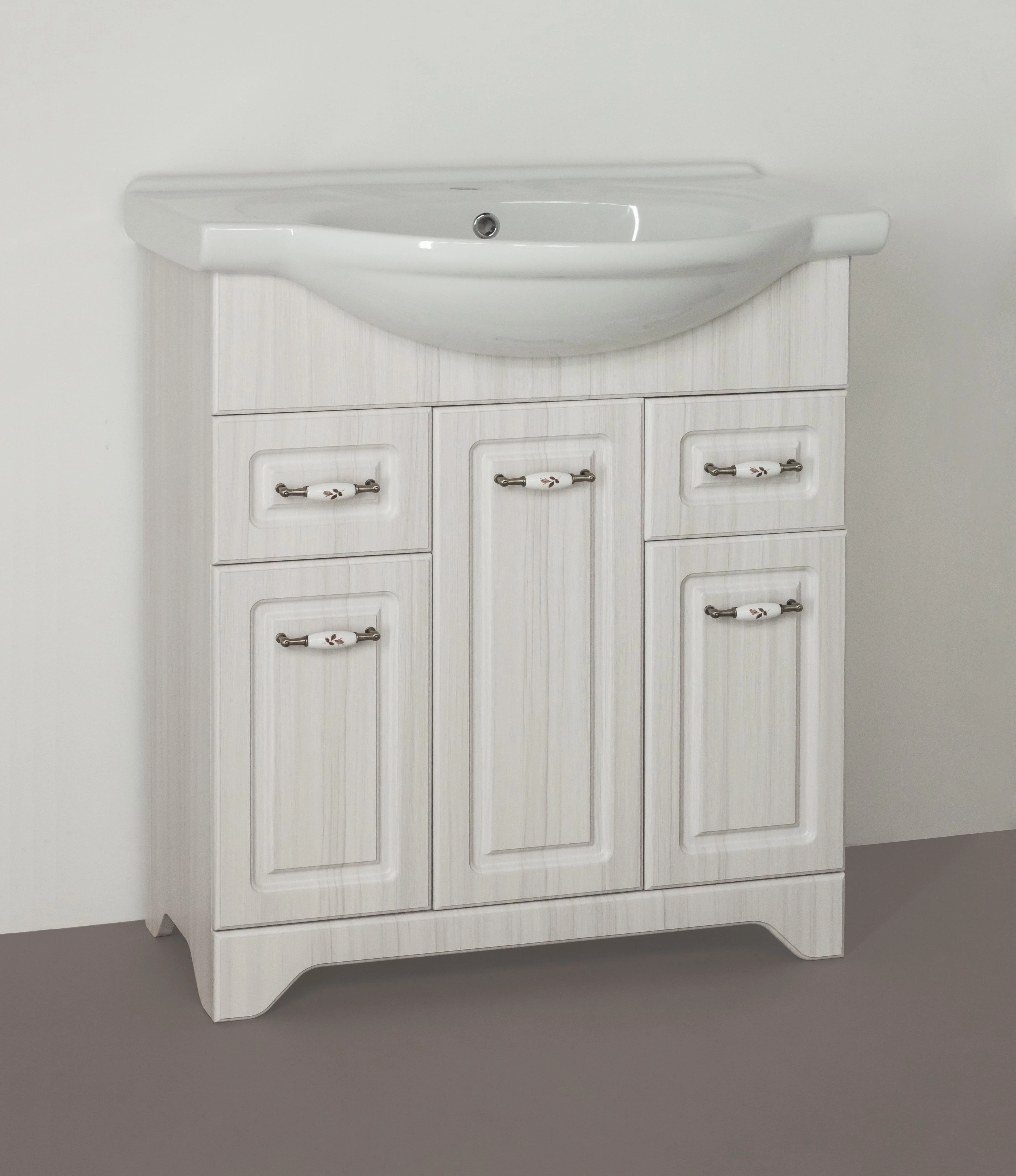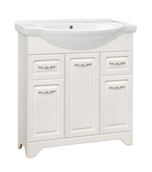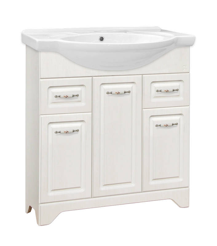 Тумба напольная бренда "Style Line" коллекции "Олеандр-2" классического дизайна, декорированная ручками с керамическими вставками "под бронзу" с изящным рисунком. Направляющие полного выдвижения Hettich; сборка изделия с помощью эксцентриковых стяжек Hafele; все материалы полностью влагостойкие. Данная тумба предусматривает открытую подводку воды