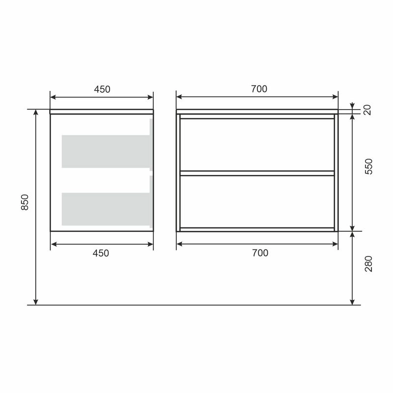 Подвесная тумба с двумя выдвижными ящиками Next Premium шириной 70 см подходит под раковину из коллекции Uperwood Next Premium 70 см (700 х 450 х 130 мм) глянцевого белого цвета (арт. 2900000091) и серого глянцевого цвета (арт. 2900000191)