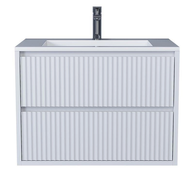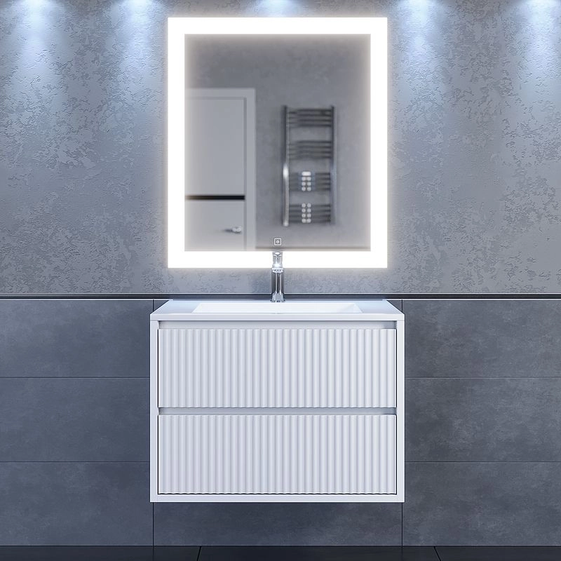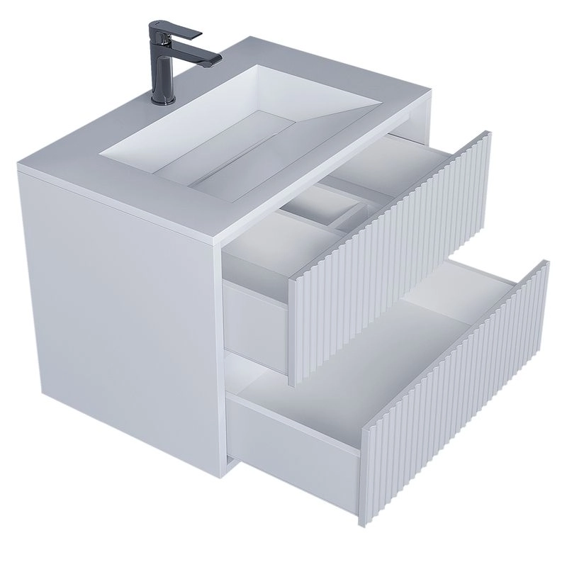 Фасад и боковые стенки изделия выполнены из МДФ толщиной 16 мм. Фасады с вертикальной фрезеровкой. Выдвижные ящики изготовлены из влагостойкой ЛДСП. Ящики оснащены доводчиками. Вся фурнитура и доводчики премиум-класса.