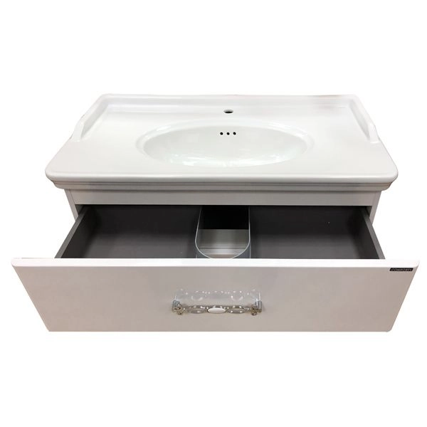 Тумба укомплектована раковиной столешницей с овальной чашей.