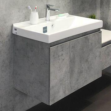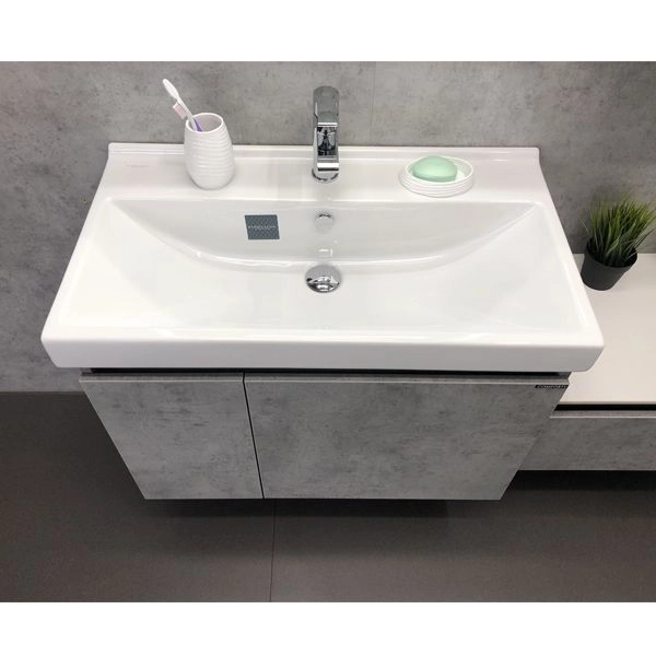 Подвесная тумба-умывальник шириной 80 см с распашной дверцей и глубоким выдвижным ящиком для хранения принадлежностей для умывания и бытовой химии.