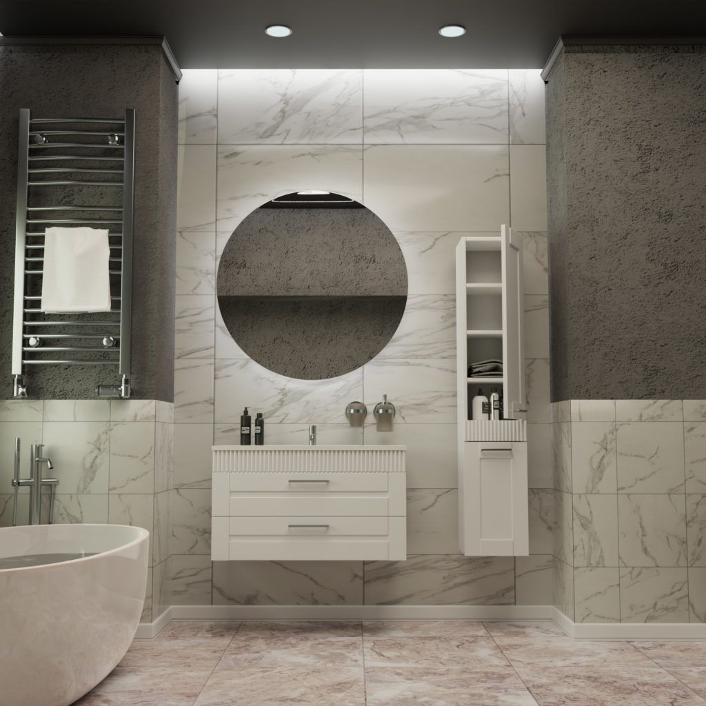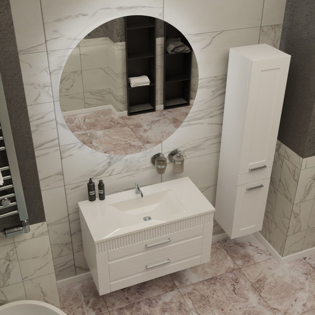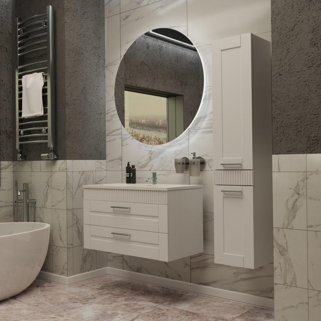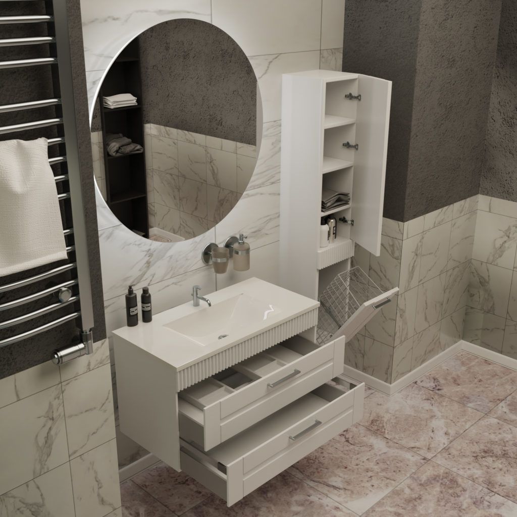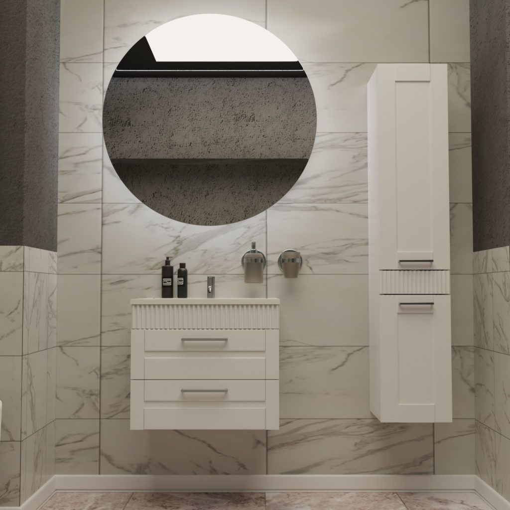 Подвесная тумба с декоративной 3Д вставкой и с двумя ящиками Мебель укомплектована механизмами плавного закрывания, накладной ручкой .Также для подвесной тумбы Турин 2 идет наборный фасад, который в паре с 3Д вставкой акцентируют внимание на оригинальность дизайна.