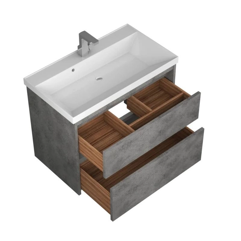 Материал корпуса МДФ. Материал фасада МДФ. Покрытие корпуса ПВХ. Покрытие фасада ПВХ. Цвет темный камень/матовый .Система хранения с ящиками. Механизм доводчика. В комплекте: крепления/организация пространства.