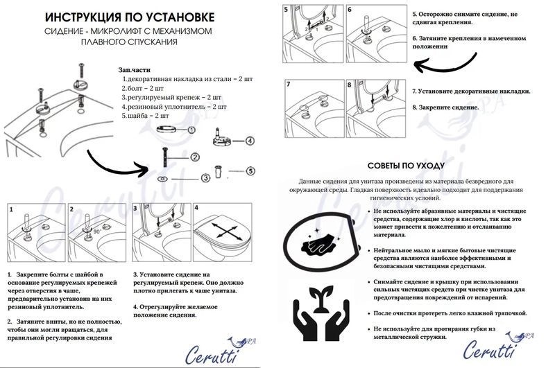 Крепления к чаше выполнены из стали, а само сидение - из долговечного полимерного материала – дюропласта с антибактериальным покрытием. Снятие осуществляется одним нажатием кнопки.