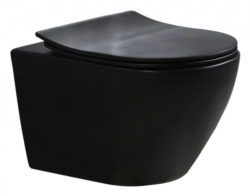 БЕЗОБОДКОВЫЙ подвесной унитаз. Горизонтальный выпуск "P-Trap" 180 мм Цвет: чёрный матовый. Сиденье: ультратонкое, быстросъёмное, дюропласт с металлическим крепежом и микролифтом механизм "Soft Close"