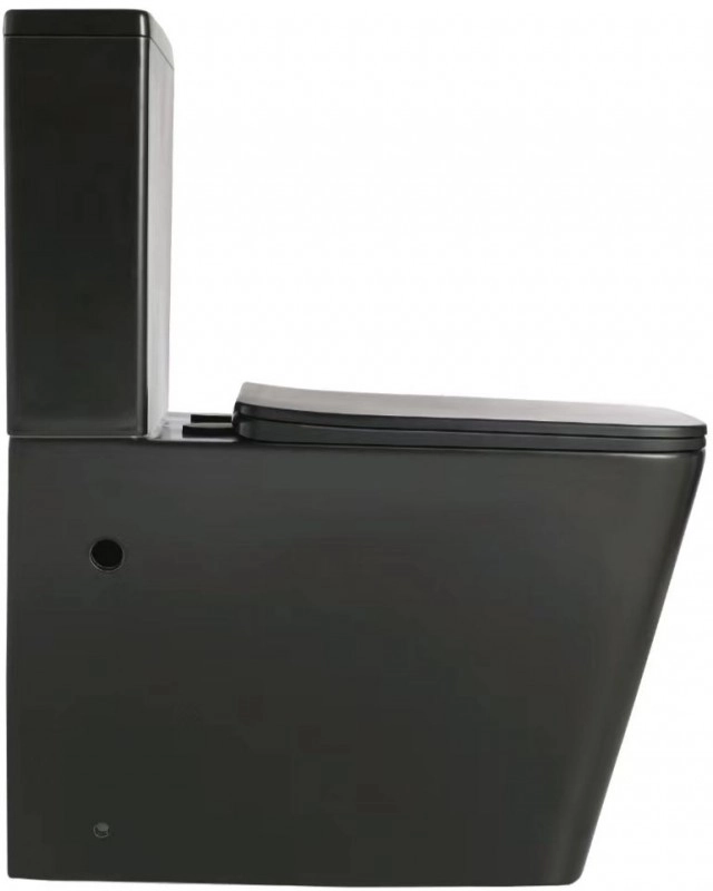 Унитаз ESBANO - DUERO Matt Black : -унитаз с безободковой системой слива -горизонтальный выпуск -диаметр выпуска 100мм -материал: фаянс -цвет: чёрный матовый -сиденье: DUROPLAST с крышкой "soft-close" - плавное опускание микролифт , быстросъемное, металлические накладки, металлический крепеж на петлях