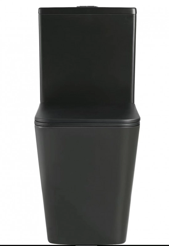 БЕЗОБОДКОВЫЙ напольный унитаз. Бортик по периметру чаши. Горизонтальный выпуск "P-Trap" Нижний подвод воды. Цвет: черный матовый. Арматура: "GEBERIT" с двойной кнопкой слива 4/6 л Сиденье: тонкое, быстросъёмное, дюропласт с металлическим крепежом и микролифтом механизм "Soft Close"