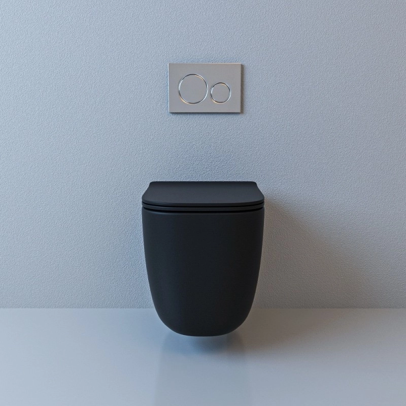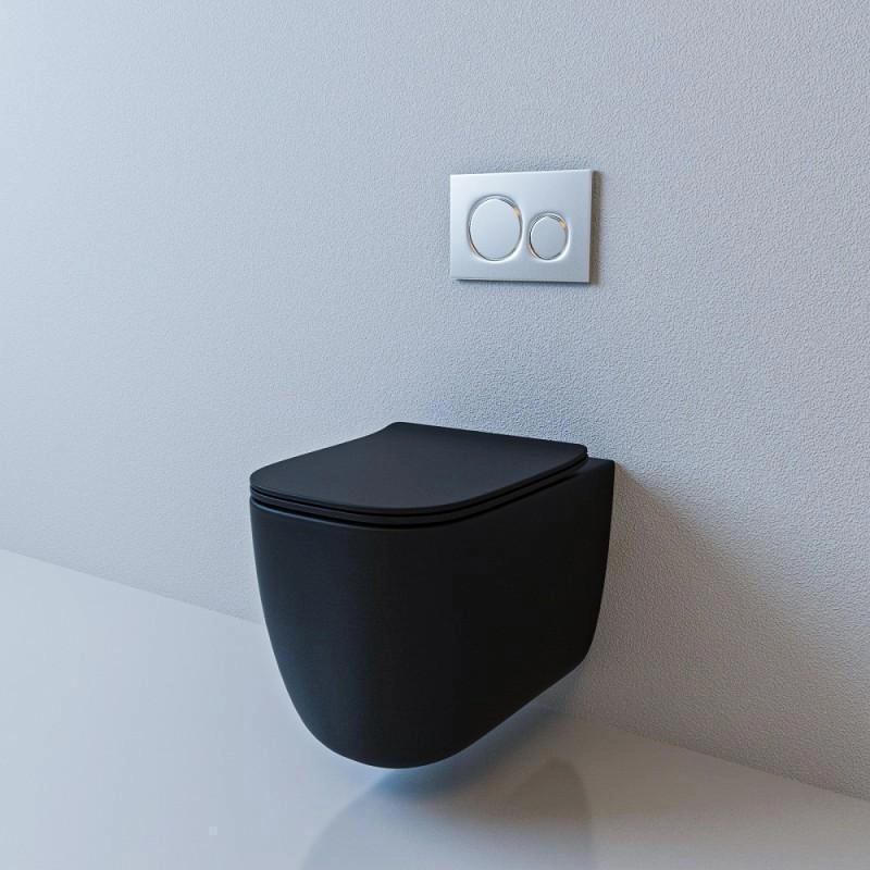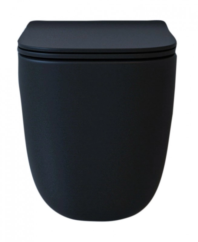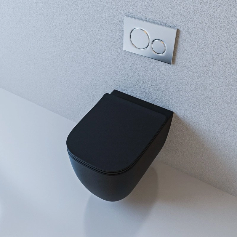 БЕЗОБОДКОВЫЙ подвесной унитаз. Горизонтальный выпуск "P-Trap" 180 мм Цвет: чёрный матовый. Сидение: ультратонкое, быстросъёмное, дюропласт с металлическим крепежом и микролифтом механизм "Soft Close"