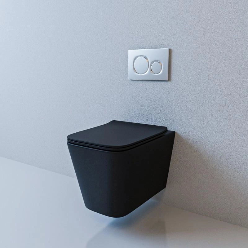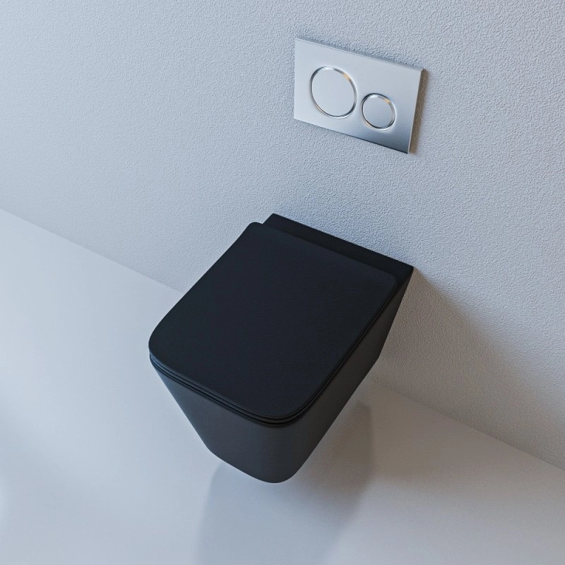 БЕЗОБОДКОВЫЙ подвесной унитаз. Горизонтальный выпуск "P-Trap" 180 мм Цвет: чёрный матовый. Сидение: ультратонкое, быстросъёмное, дюропласт с металлическим крепежом и микролифтом механизм "Soft Close"