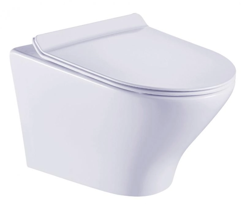 БЕЗОБОДКОВЫЙ подвесной унитаз. Бортик по периметру чаши. Горизонтальный выпуск "P-Trap" 180 мм Цвет: белый. Сиденье: ультратонкое, быстросъёмное, дюропласт с металлическим крепежом и микролифтом механизм "Soft Close"