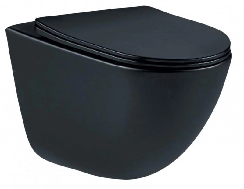 БЕЗОБОДКОВЫЙ подвесной унитаз. Бортик по периметру чаши. Горизонтальный выпуск "P-Trap" 180 мм Цвет: чёрный матовый. Сиденье: ультратонкое, быстросъёмное, дюропласт с металлическим крепежом и микролифтом механизм "Soft Close"