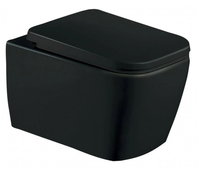 БЕЗОБОДКОВЫЙ подвесной унитаз. Бортик по периметру чаши. Горизонтальный выпуск "P-Trap" 180 мм Цвет: чёрный матовый. Сиденье: ультратонкое, быстросъёмное, дюропласт с металлическим крепежом и микролифтом механизм "Soft Close"