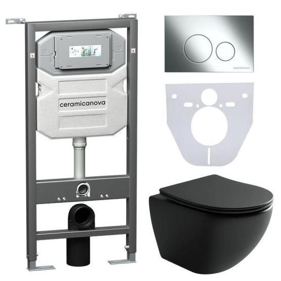 Сет 4 в 1: Подвесной унитаз Metropol Rimless арт. CN4002MB + Шумоизоляционная панель для инсталляции арт. CN1000 + Система инсталляции для унитазов CERAMICANOVA Envision с кнопкой смыва Round цвет хром и креплениями, арт. CN1001CH