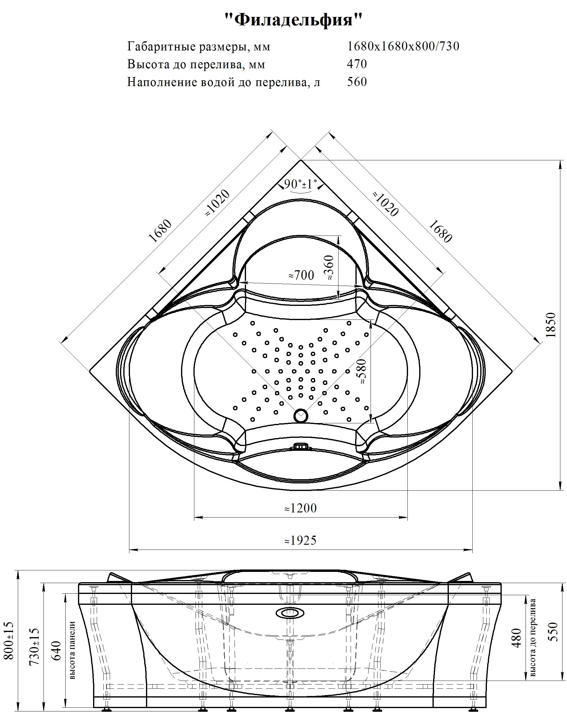 Акриловая угловая ванна "Филадельфия" 168х168 - комфорт и пространство для двоих. Два полноценных места и глубокое сиденье в углу являются гарантией комфортного купания. По-настоящему просторная и широкая треугольная ванна по своим габаритам и функционалу максимально приближена к спа-бассейну и создана, чтобы дарить удовольствие.