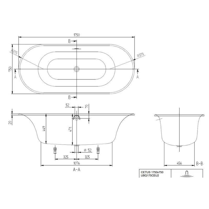 Ванна Villeroy&Boch Cetus, ширина, мм-1750, глубина, мм-750, высота, мм-471, водоизмещение (л)-140, тип установки-встраиваемый, форма-овальная, слив-перелив-необходимо заказать, диаметр слива, мм-52, ножки-есть, материал-Quaryl, цвет-белый